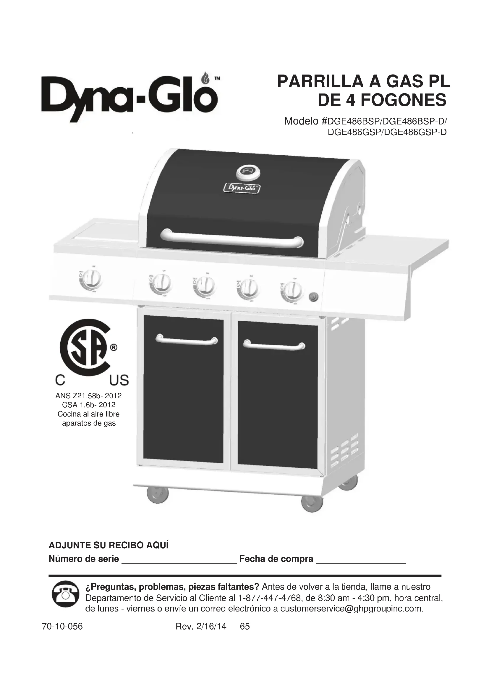 Número de serie _______________________ Fecha de compra __________________ ¿Preguntas, problemas, piezas faltantes? Antes de volver a la tienda, llame a nuestro Departamento de Servicio al Cliente al 1-877-447-4768, de 8:30 am - 4:30 pm, hora central, de lunes - viernes o envíe un correo electrónico a customerservice@ghpgroupinc.com. 70-10-056 Rev. 2/16/14 ANS Z21.58b- 2012 CSA 1.6b- 2012 Cocina al aire libre aparatos de gas Modelo #DGE486BSP/DGE486BSP-D/