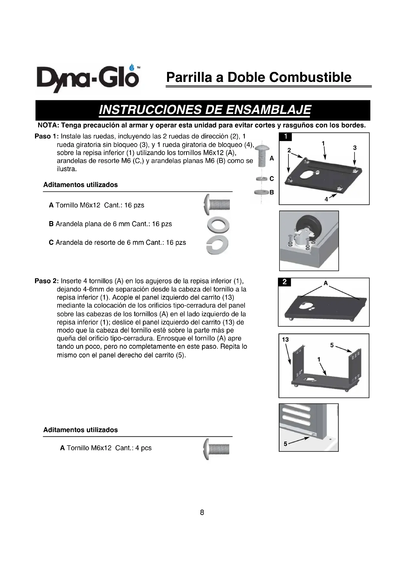 Parrilla a Doble Combustible11 Aditamentos utilizados A Tornillo M6x12 Cant.: 2 pcs Paso 7: Pre-ensamble la platina vertical frontal del carrito (8) y la abrazadera de la puerta delantera superior (11) formando una "T", utilizando dos tornillos M6x12 (A). Paso 8: Pre-ensamble la platina vertical frontal del carrito (8) y abrazadera de la puerta delantera superior (11) como una "T". Inserte dos tornillos M6x12 (A) en cada uno de los agujeros de montaje superiores (etiquetados como AA) en los paneles izquierdo y derecho del carrito (13 y 5), dejando 4-6mm de separación desde la cabeza del tornillo a los paneles izquierdo y derecho del carrito (13 y 5). Acople la platina vertical frontal del carrito (8) y el ensamble de la abrazadera de la puerta frontal superior (11) mediante la colocación de los agujeros tipo-cerradura sobre la cabeza del tornillo insertado (A) en los paneles laterales (13 y 5); deslice la abrazadera de la puerta frontal superior (11) de modo que la cabeza del tornillo esté sobre el orificio más pequeño. Asegure los tornillos, pero no los apriete completamente en este momento. Asegure otros dos tornillos M6x12 en los orificios (etiquetados como BB). Finalmente, asegure la platina vertical frontal del carrito (8) a la repisa inferior (etiquetada como CC) utilizando dos tornillos M6x12 (A).). Aditamentos utilizados A Tornillo M6x12 Cant.: 6 pcs