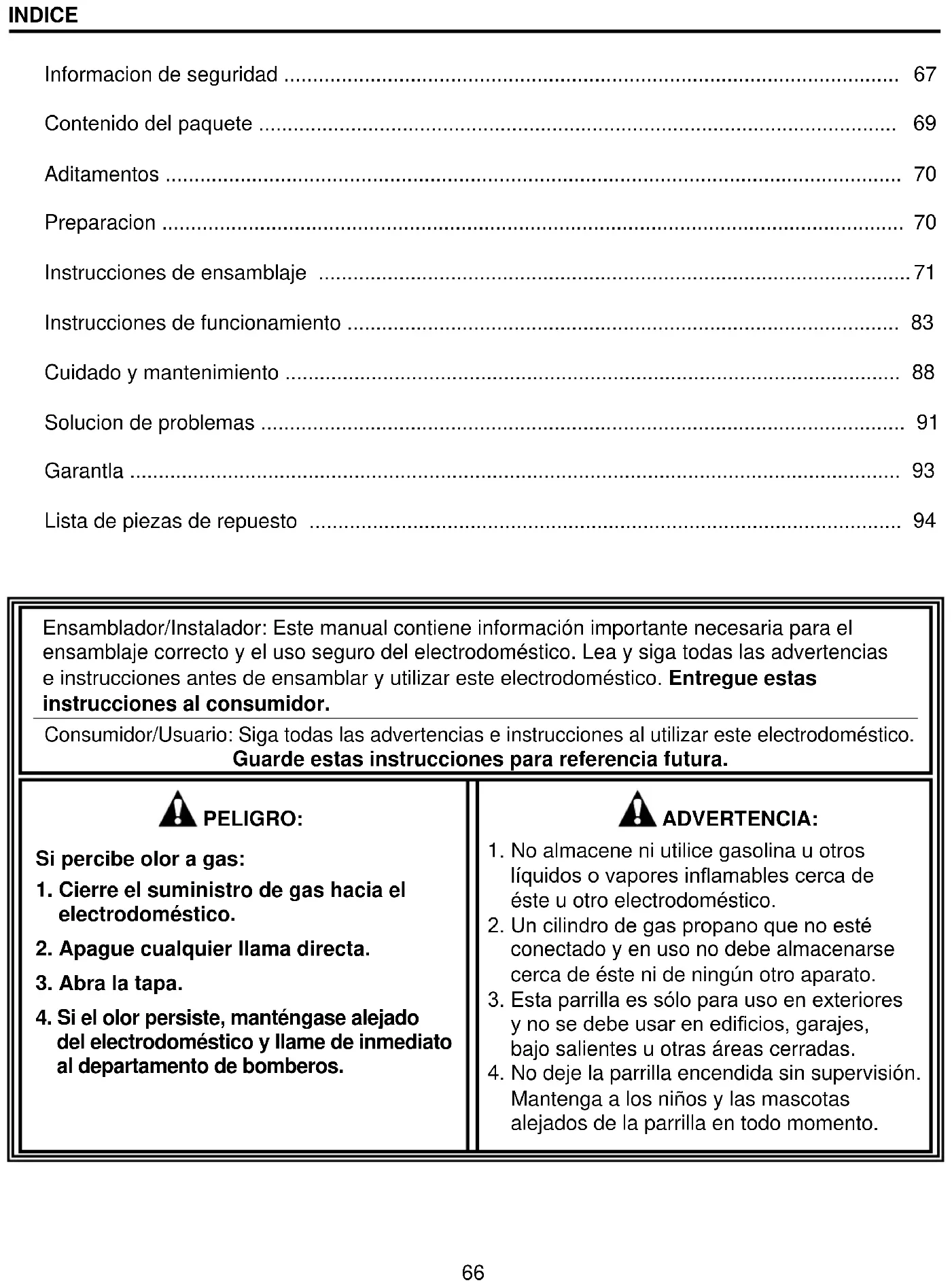 Ensamblador/Instalador: Este manual contiene información importante necesaria para el ensamblaje correcto y el uso seguro del electrodoméstico. Lea y siga todas las advertencias e instrucciones antes de ensamblar y utilizar este electrodoméstico. Entregue estas instrucciones al consumidor. Consumidor/Usuario: Siga todas las advertencias e instrucciones al utilizar este electrodoméstico. Guarde estas instrucciones para referencia futura. Si percibe olor a gas: