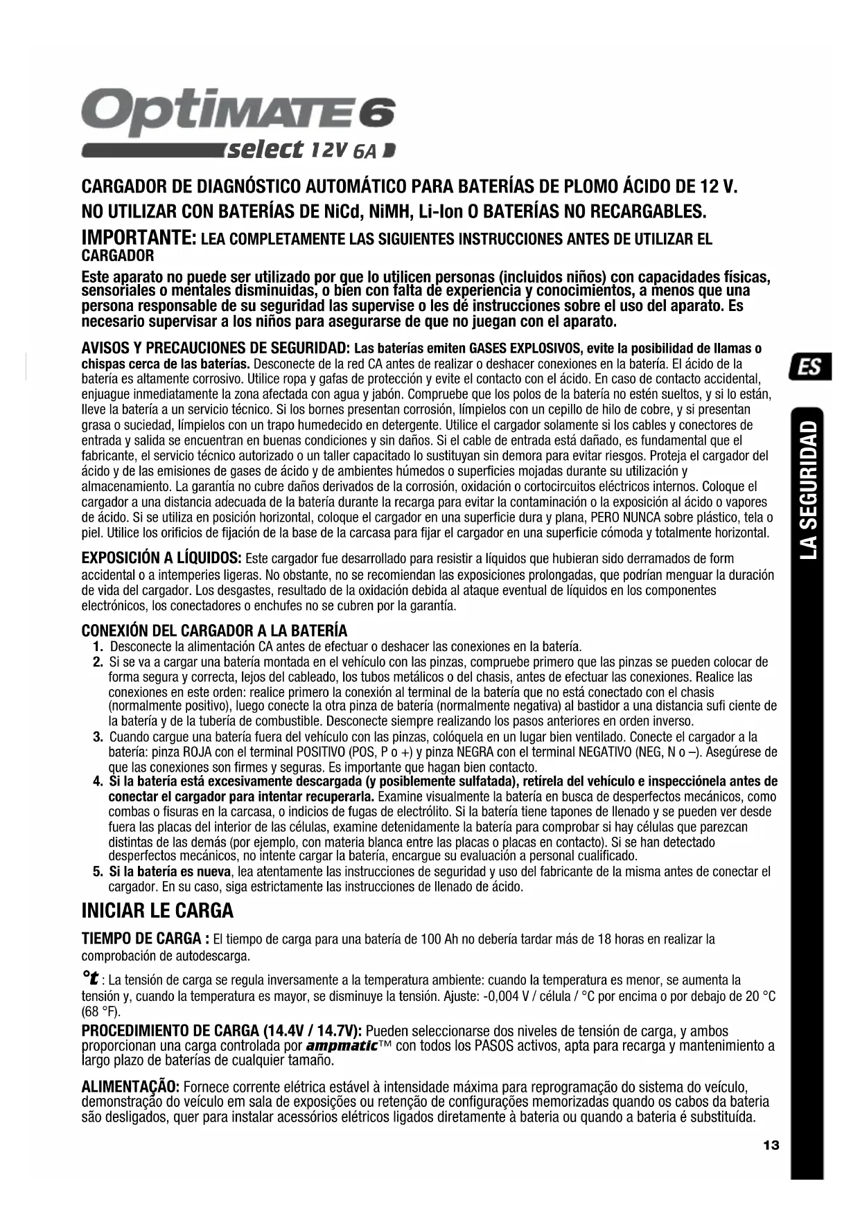 select CARGADOR DE DIAGNÓSTICO AUTOMÁTICO PARA BATERÍAS DE PLOMO ÁCIDO DE 12 V. NO UTILIZAR CON BATERÍAS DE NiCd, NiMH, Li-Ion O BATERÍAS NO RECARGABLES. IMPORTANTE: LEA COMPLETAMENTE LAS SIGUIENTES INSTRUCCIONES ANTES DE UTILIZAR EL CARGADOREste aparato no puede ser utilizado por que lo utilicen personas (incluidos niños) con capacidades físicas, sensoriales o mentales disminuidas, o bien con falta de experiencia y conocimientos, a menos que una persona responsable de su seguridad las supervise o les dé instrucciones sobre el uso del aparato. Es necesario supervisar a los niños para asegurarse de que no juegan con el aparato.AVISOS Y PRECAUCIONES DE SEGURIDAD: Las baterías emiten GASES EXPLOSIVOS, evite la posibilidad de llamas o chispas cerca de las baterías. Desconecte de la red CA antes de realizar o deshacer conexiones en la batería. El ácido de la batería es altamente corrosivo. Utilice ropa y gafas de protección y evite el contacto con el ácido. En caso de contacto accidental, enjuague inmediatamente la zona afectada con agua y jabón. Compruebe que los polos de la batería no estén sueltos, y si lo están, lleve la batería a un servicio técnico. Si los bornes presentan corrosión, límpielos con un cepillo de hilo de cobre, y si presentan grasa o suciedad, límpielos con un trapo humedecido en detergente. Utilice el cargador solamente si los cables y conectores de entrada y salida se encuentran en buenas condiciones y sin daños. Si el cable de entrada está dañado, es fundamental que el fabricante, el servicio técnico autorizado o un taller capacitado lo sustituyan sin demora para evitar riesgos. Proteja el cargador del ácido y de las emisiones de gases de ácido y de ambientes húmedos o superficies mojadas durante su utilización y almacenamiento. La garantía no cubre daños derivados de la corrosión, oxidación o cortocircuitos eléctricos internos. Coloque el cargador a una distancia adecuada de la batería durante la recarga para evitar la contaminación o la exposición al ácido o vapores de ácido. Si se utiliza en posición horizontal, coloque el cargador en una superficie dura y plana, PERO NUNCA sobre plástico, tela o piel. Utilice los orificios de fijación de la base de la carcasa para fijar el cargador en una superficie cómoda y totalmente horizontal. EXPOSICIÓN A LÍQUIDOS: Este cargador fue desarrollado para resistir a líquidos que hubieran sido derramados de form accidental o a intemperies ligeras. No obstante, no se recomiendan las exposiciones prolongadas, que podrían menguar la duración de vida del cargador. Los desgastes, resultado de la oxidación debida al ataque eventual de líquidos en los componentes electrónicos, los conectadores o enchufes no se cubren por la garantía.CONEXIÓN DEL CARGADOR A LA BATERÍA1. Desconecte la alimentación CA antes de efectuar o deshacer las conexiones en la batería. 2. Si se va a cargar una batería montada en el vehículo con las pinzas, compruebe primero que las pinzas se pueden colocar de forma segura y correcta, lejos del cableado, los tubos metálicos o del chasis, antes de efectuar las conexiones. Realice las conexiones en este orden: realice primero la conexión al terminal de la batería que no está conectado con el chasis (normalmente positivo), luego conecte la otra pinza de batería (normalmente negativa) al bastidor a una distancia sufi ciente de la batería y de la tubería de combustible. Desconecte siempre realizando los pasos anteriores en orden inverso. 3. Cuando cargue una batería fuera del vehículo con las pinzas, colóquela en un lugar bien ventilado. Conecte el cargador a la batería: pinza ROJA con el terminal POSITIVO (POS, P o +) y pinza NEGRA con el terminal NEGATIVO (NEG, N o –). Asegúrese de que las conexiones son firmes y seguras. Es importante que hagan bien contacto. 4. Si la batería está excesivamente descargada (y posiblemente sulfatada), retírela del vehículo e inspecciónela antes de conectar el cargador para intentar recuperarla. Examine visualmente la batería en busca de desperfectos mecánicos, como combas o fisuras en la carcasa, o indicios de fugas de electrólito. Si la batería tiene tapones de llenado y se pueden ver desde fuera las placas del interior de las células, examine detenidamente la batería para comprobar si hay células que parezcan distintas de las demás (por ejemplo, con materia blanca entre las placas o placas en contacto). Si se han detectado desperfectos mecánicos, no intente cargar la batería, encargue su evaluación a personal cualificado. 5. Si la batería es nueva, lea atentamente las instrucciones de seguridad y uso del fabricante de la misma antes de conectar el cargador. En su caso, siga estrictamente las instrucciones de llenado de ácido.