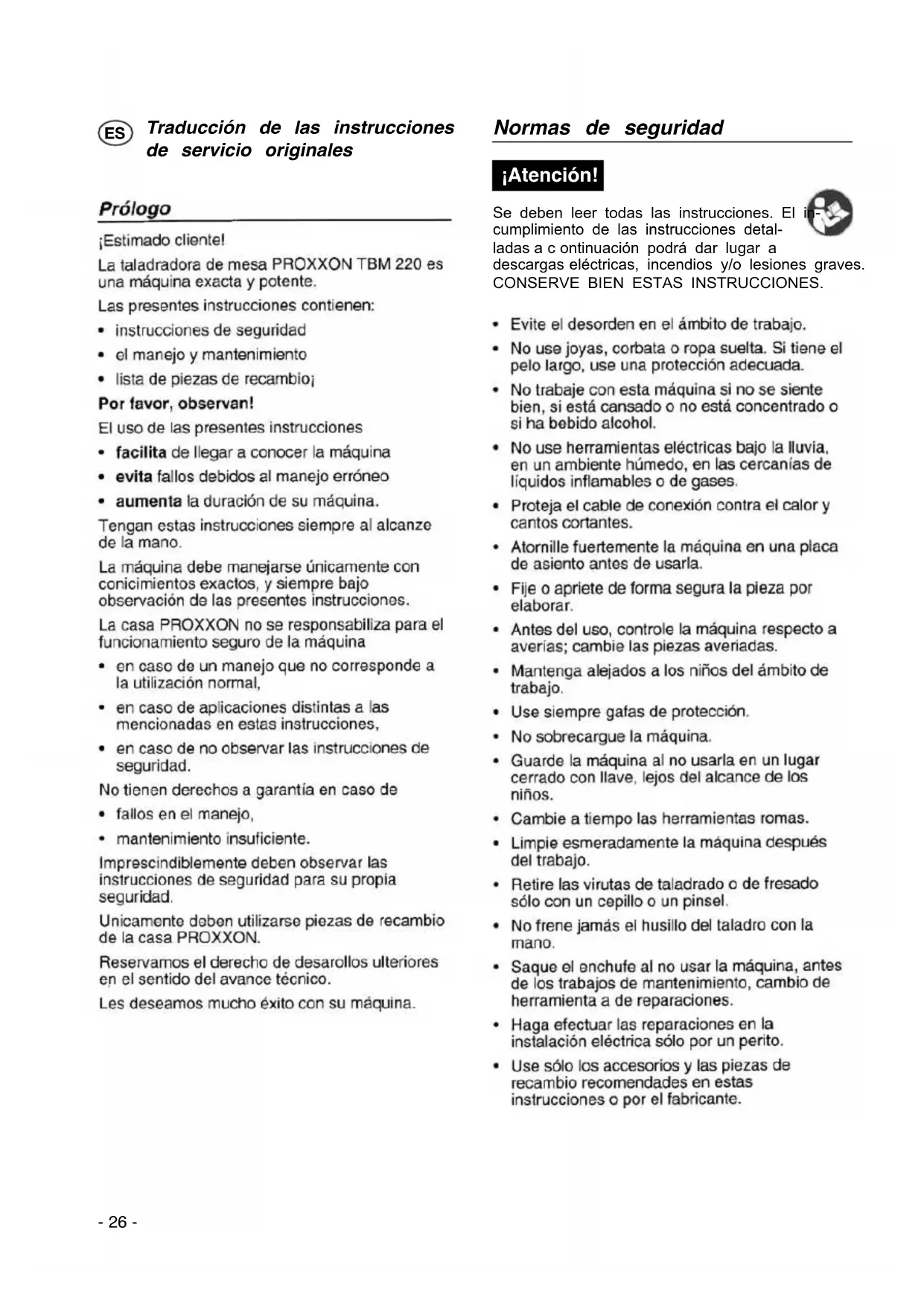- ¡Al trabajar con el aparato realice suficientes pausas según necesidad!-28- Sólo para utilización en recintos secos Aparato con clase de protecciónII Por favor no deshacerse de esta maquina arroja ndola alabasura!-29- Mantenimiento, limpieza yconservación: ¡Antes de cualquier ajuste, medida de conser- vación oreparación, extraer la clavija de la red! ¡Atención!-30- Declaración de conformidad CE Nombreydirección del fabricante: PROXXON S.A., 6-10, Härebierg, L-6868 Wecker Denominación de producto: TBM 220 Artículo Nº: 28128 Declaramos bajo exclusiva responsabilidad, que este producto cumple las siguientes normas ydocumentos normativos: Directiva de compatibilidad electromagnética UE 2014/30/CE