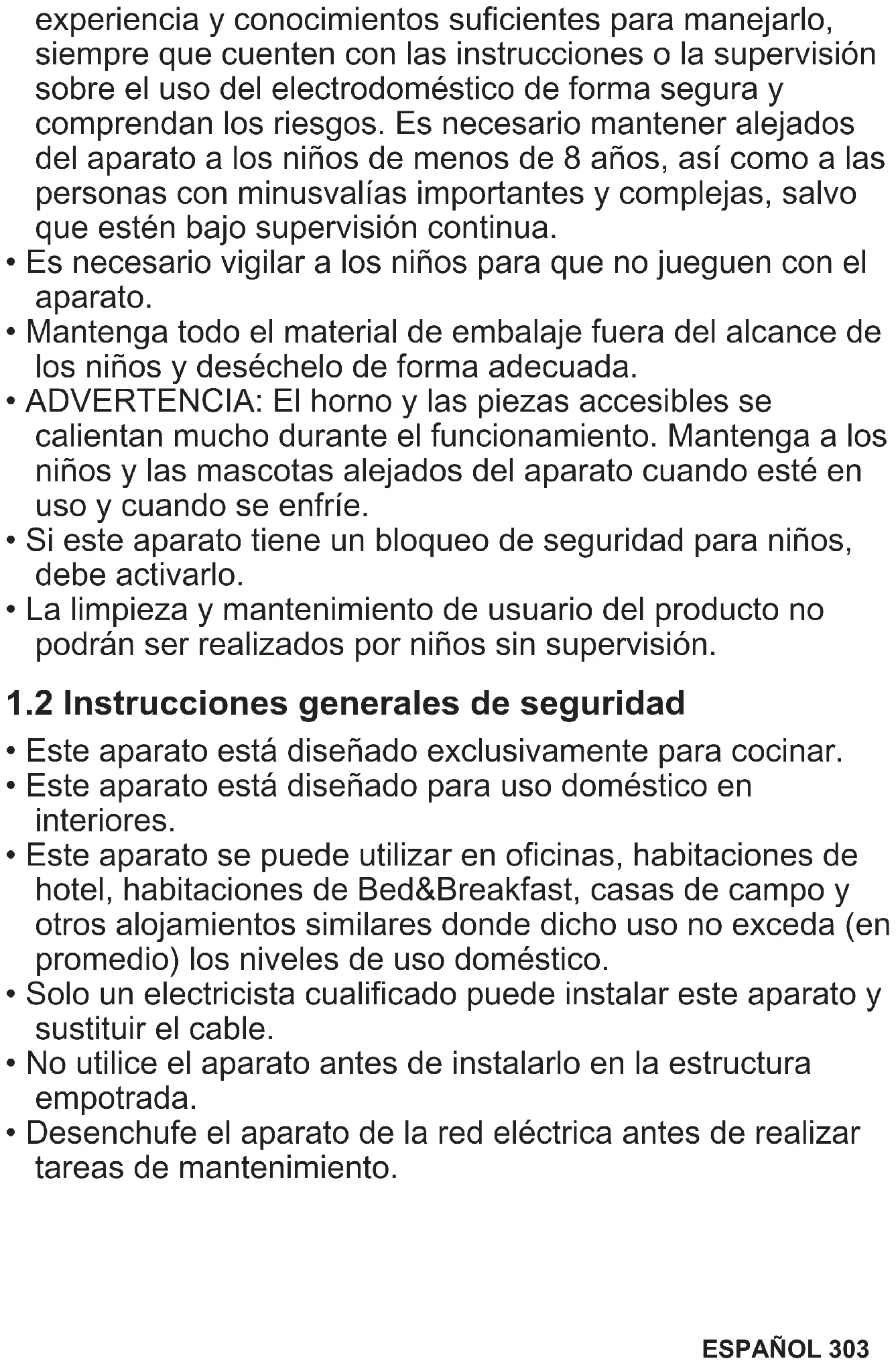 - Este aparato puede ser utilizado por niños de 8 años en adelante y personas cuyas capacidades físicas, sensoriales o mentales estén disminuidas o que carezcan de la 302 ESPAÑOLexperiencia y conocimientos suficientes para manejarlo, siempre que cuenten con las instrucciones o la supervisión sobre el uso del electrodoméstico de forma segura y comprendan los riesgos. Es necesario mantener alejados del aparato a los niños de menos de 8 años, así como a las personas con minusvalías importantes y complejas, salvo que estén bajo supervisión continua.