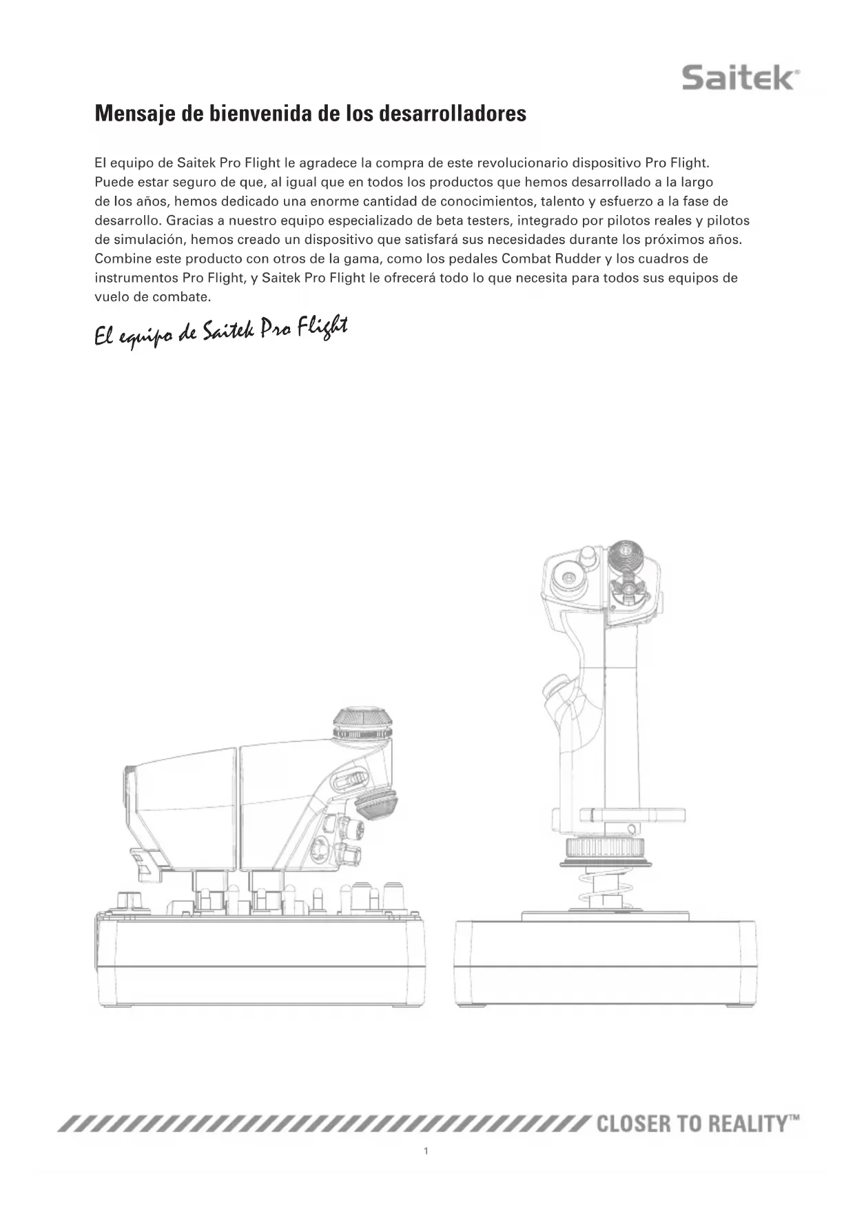 Mensaje de bienvenida de los desarrolladores El equipo de Saitek Pro Flight le agradece la compra de este revolucionario dispositivo Pro Flight. Puede estar seguro de que, al igual que en todos los productos que hemos desarrollado a la largo de los años, hemos dedicado una enorme cantidad de conocimientos, talento y esfuerzo a la fase de desarrollo. Gracias a nuestro equipo especializado de beta testers, integrado por pilotos reales y pilotos de simulación, hemos creado un dispositivo que satisfará sus necesidades durante los próximos años. Combine este producto con otros de la gama, como los pedales Combat Rudder y los cuadros de instrumentos Pro Flight, y Saitek Pro Flight le ofrecerá todo lo que necesita para todos sus equipos de vuelo de combate. El equipo de Saitek Pro Flight2