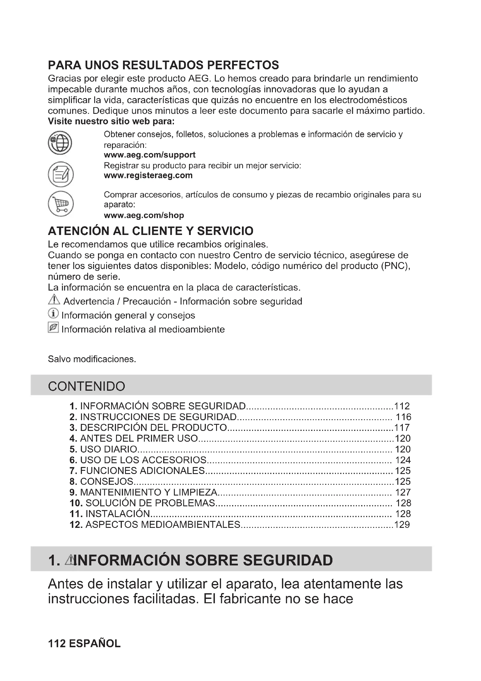 Le recomendamos que utilice recambios originales.Cuando se ponga en contacto con nuestro Centro de servicio técnico, asegúrese detener los siguientes datos disponibles: Modelo, código numérico del producto (PNC),número de serie.La información se encuentra en la placa de características. Advertencia / Precaución - Información sobre seguridad Información general y consejos Información relativa al medioambienteSalvo modificaciones. CONTENIDO 1. INFORMACIÓN SOBRE SEGURIDAD.......................................................1122. INSTRUCCIONES DE SEGURIDAD.......................................................... 1163. DESCRIPCIÓN DEL PRODUCTO..............................................................117