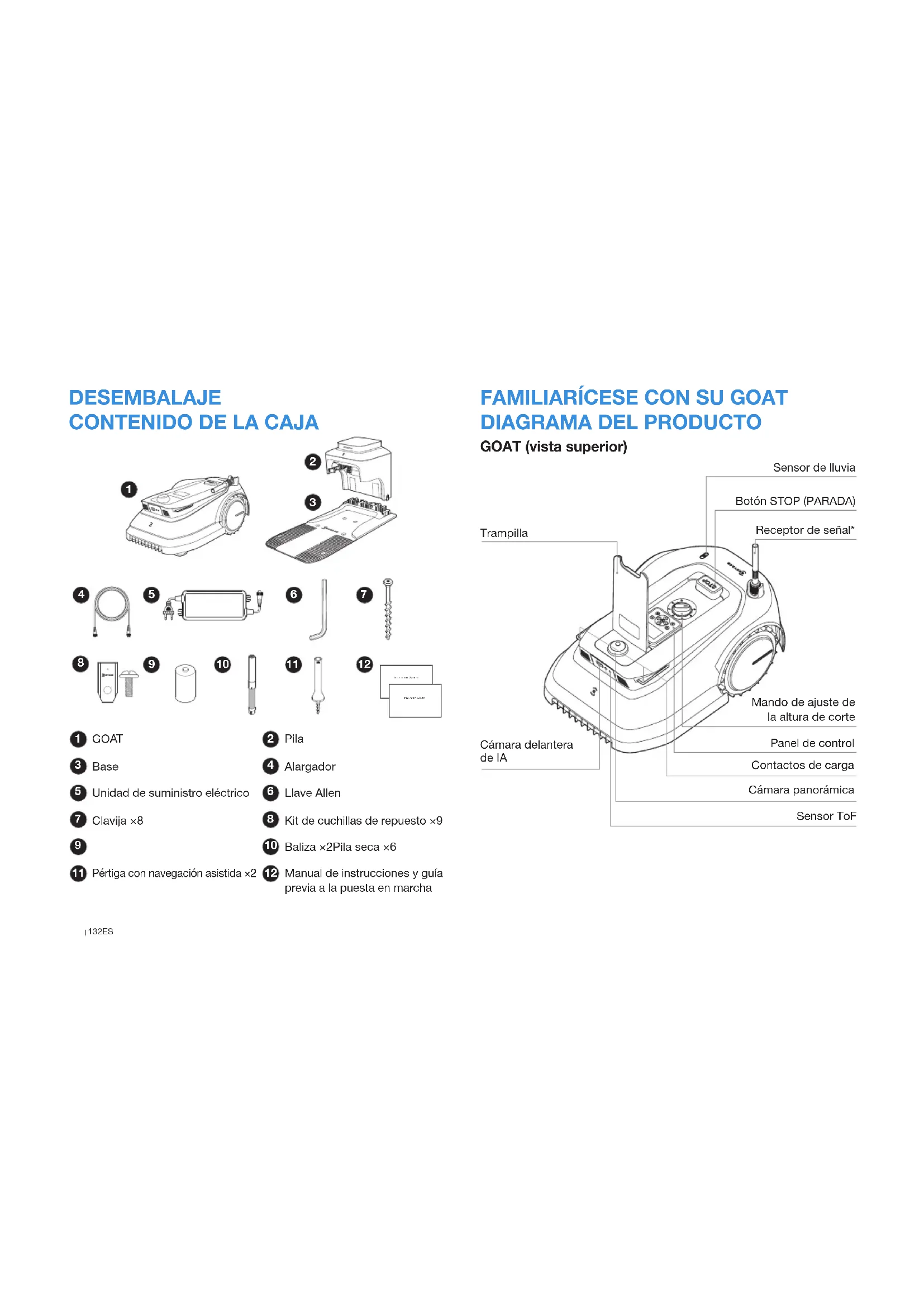 GOAT (vista superior) Sensor de lluvia Botón STOP (PARADA) Receptor de señal* Mando de ajuste de la altura de corte Panel de control Contactos de carga Cámara panorámica Sensor ToF Trampilla Cámara delantera de IA GOAT Unidad de suministro eléctrico Alargador Kit de cuchillas de repuesto ×9 Manual de instrucciones y guía previa a la puesta en marcha Pila Llave Allen Baliza ×2Pila seca ×6 Base Clavija ×8 Pértiga con navegación asistida ×2