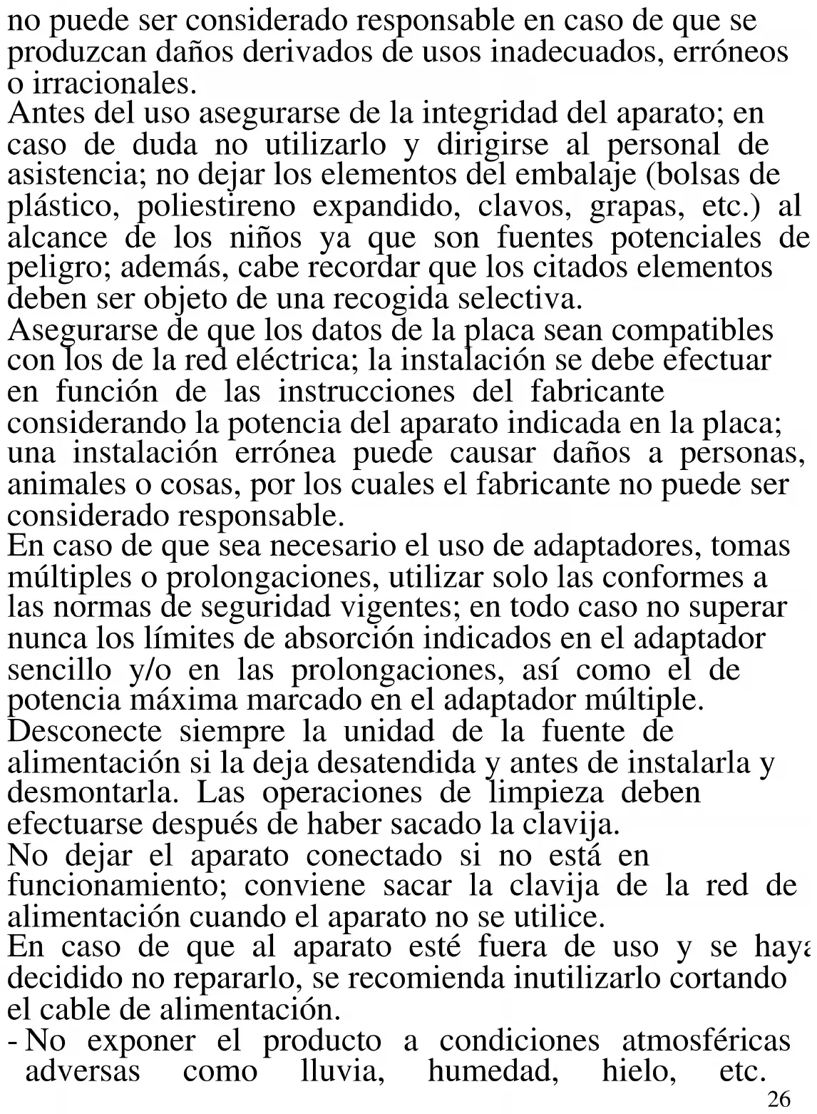 A continuación se presentan importantes indicaciones sobre la instalación, el uso y el mantenimiento. Conservar con cuidado este manual para cualquier consulta posterior; utilizar el producto solo de la manera que indica este manual de instrucciones; cualquier otro uso se considera inadecuado y peligroso; por ello el fabricante26 no puede ser considerado responsable en caso de que se produzcan daños derivados de usos inadecuados, erróneos o irracionales. Antes del uso asegurarse de la integridad del aparato; en caso de duda no utilizarlo y dirigirse al personal de asistencia; no dejar los elementos del embalaje (bolsas de plástico, poliestireno expandido, clavos, grapas, etc.) al alcance de los niños ya que son fuentes potenciales de peligro; además, cabe recordar que los citados elementos deben ser objeto de una recogida selectiva. Asegurarse de que los datos de la placa sean compatibles con los de la red eléctrica; la instalación se debe efectuar en función de las instrucciones del fabricante considerando la potencia del aparato indicada en la placa; una instalación errónea puede causar daños a personas, animales o cosas, por los cuales el fabricante no puede ser considerado responsable. En caso de que sea necesario el uso de adaptadores, tomas múltiples o prolongaciones, utilizar solo las conformes a las normas de seguridad vigentes; en todo caso no superar nunca los límites de absorción indicados en el adaptador sencillo y/o en las prolongaciones, así como el de potencia máxima marcado en el adaptador múltiple. Desconecte siempre la unidad de la fuente de alimentación si la deja desatendida y antes de instalarla y desmontarla. Las operaciones de limpieza deben efectuarse después de haber sacado la clavija. No dejar el aparato conectado si no está en funcionamiento; conviene sacar la clavija de la red de alimentación cuando el aparato no se utilice. En caso de que al aparato esté fuera de uso y se haya decidido no repararlo, se recomienda inutilizarlo cortando el cable de alimentación. - No exponer el producto a condiciones atmosféricas adversas como lluvia, humedad, hielo, etc.27 Conservarlo en lugares secos. No manejar o tocar el producto con las manos húmedas o los pies descalzos. - No acercar el cable de alimentación a objetos cortantes o a superficies calientes y no tirar del mismo para sacar la clavija. No deje que cuelgue de la superficie de trabajo donde un niño pueda sostenerla. No utilizar el producto en caso de daños en el cable de alimentación, en la clavija o en caso de cortocircuitos; llevar a reparar el producto por parte de un centro de asistencia autorizado. - Este aparato puede ser utilizado por niños a partir de 8 años y por personas con capacidades físicas, sensoriales o mentales reducidas o con falta de experiencia o conocimiento si a dichas personas se ha asegurado una supervisión adecuada o bien si han recibido instrucciones sobre el uso seguro del aparato; las operaciones de limpieza y de mantenimiento no deben ser efectuadas por niños a no ser que tengan más de 8 años y estén supervisados. - Mantener el producto y el cable fuera del alcance de los niños menores de 8 años. - Los niños no deben jugar con el aparato. - No apto para uso comercial. Solo para uso doméstico En caso de avería y/o de funcionamiento anómalo no manipular el aparato. Para una posible reparación, dirigirse únicamente a un centro autorizado por el fabricante y solicitar el uso de recambios originales. El incumplimiento de lo indicado anteriormente puede comprometer la seguridad del aparato y anular las condiciones de la garantía. ATENCIÓN: el producto tiene una función de calentamiento. Las superficies pueden desarrollar altas temperaturas. La percepción de la temperatura es distinta para cada persona, utilizar el aparato con cautela. Tocar solo las superficies diseñadas para ser tocadas, y usar agarradores o guantes de cocina.28 Este aparato está diseñado para uso doméstico o similares: cocinas para el personal de tiendas, oficinas u otros centros de trabajo, para clientes de hoteles, moteles, hostales y similares. Antes de cada uso, desenrolle el cable de alimentación. El aparato no está diseñado para su uso a través de temporizadores externos o mandos a distancia. Utilice únicamente piezas de repuesto y accesorios originales. No someta el producto a impactos fuertes se producirán daños serios. Mantenga la unidad lejos de materiales inflamables, calor, puntos fríos y vapor.