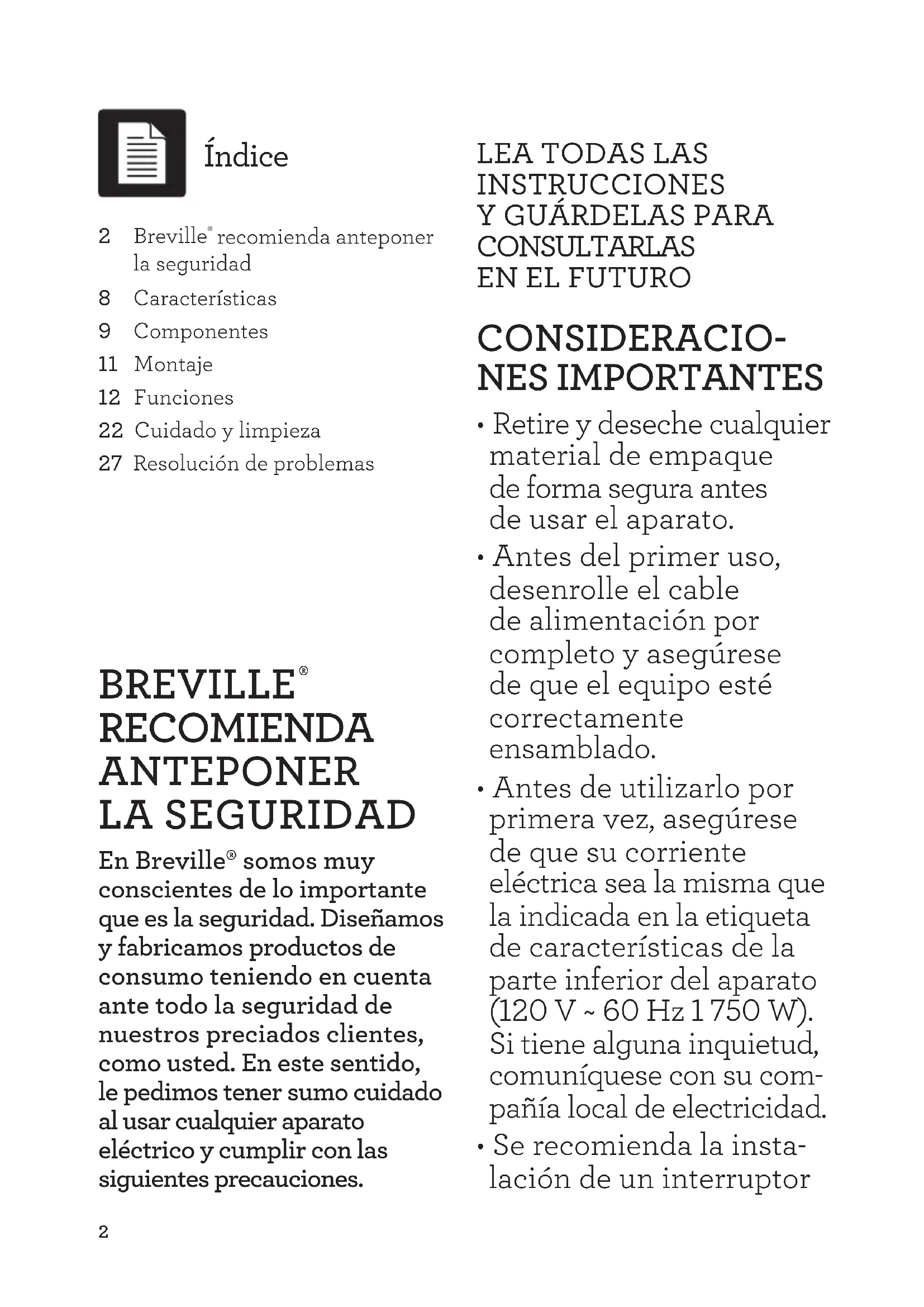RECOMIENDA ANTEPONER LA SEGURIDAD En Breville® somos muy conscientes de lo importante que es la seguridad. Diseñamos y fabricamos productos de consumo teniendo en cuenta ante todo la seguridad de nuestros preciados clientes, como usted. En este sentido, le pedimos tener sumo cuidado al usar cualquier aparato eléctrico y cumplir con las siguientes precauciones.