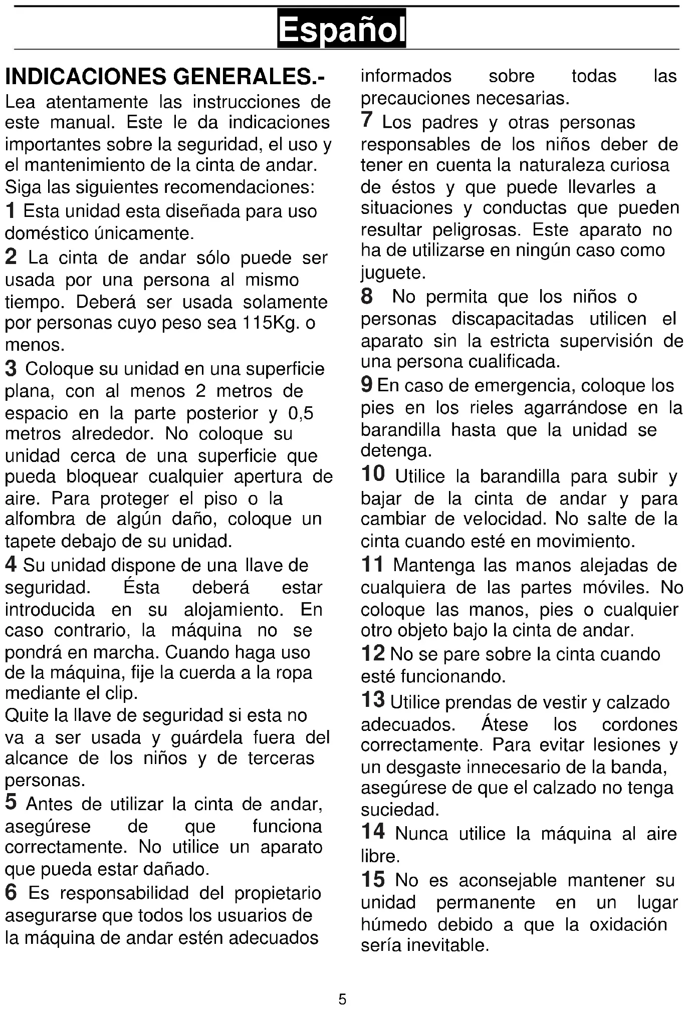 La cinta de andar sólo puede ser usada por una persona al mismo tiempo. Deberá ser usada solamente por personas cuyo peso sea 115Kg. o menos.