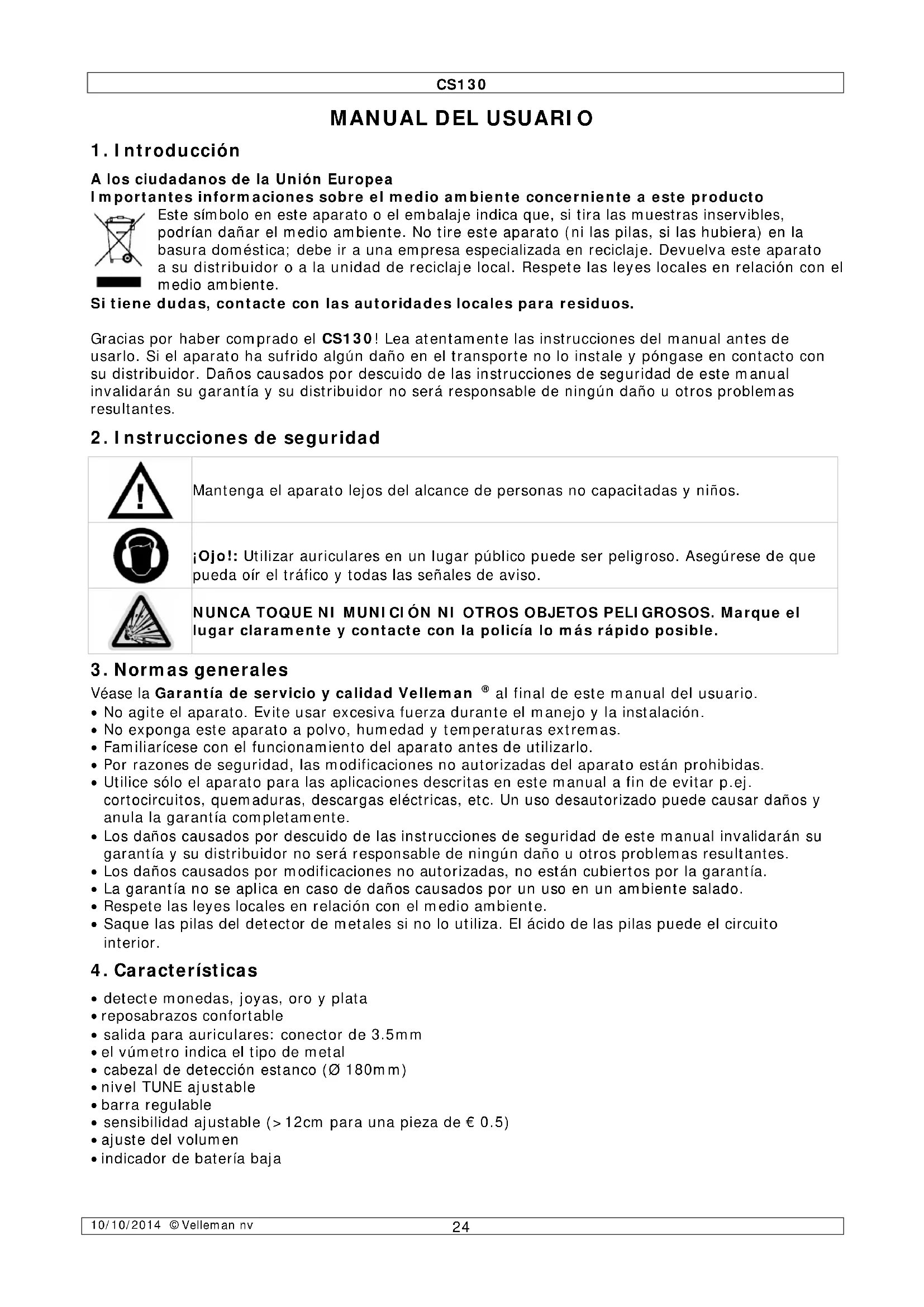 Descarga las instrucciones para tu Detector en formato PDF gratis! Encuentra tus instrucciones CS130 - VELLEMAN y toma tu dispositivo electrónico nuevamente en la mano. En esta página están publicados todos los documentos necesarios para el uso de su dispositivo. CS130 de la marca VELLEMAN.