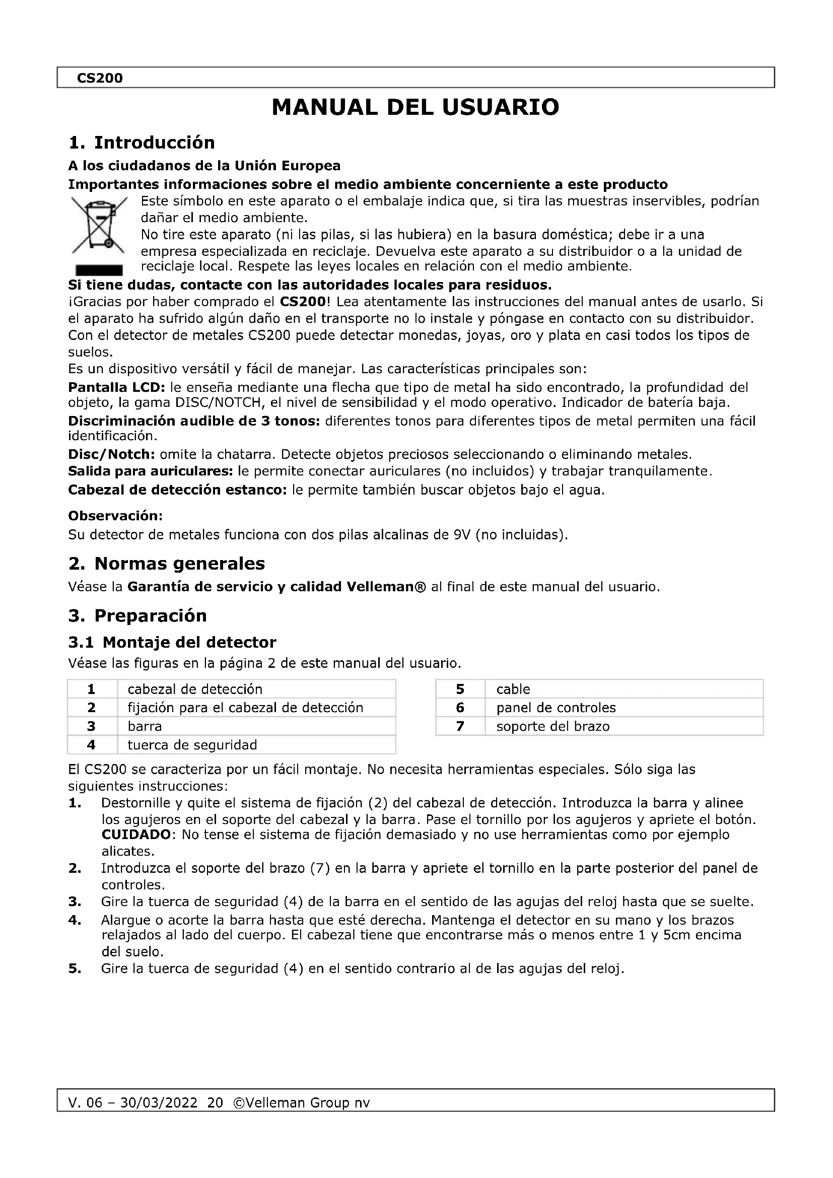alimentación ......................................................................................... 2 x pila 9 V (no incl.) frecuencia ................................................................................................................ 6.6 kHz sensibilidad ................................................................................................................ 15 cm dimensiones cabezal de detección .............................................................................. Ø 20 cm temperatura de funcionamiento ........................................................................... 0 °C a 40 °C temperatura de almacenamiento ....................................................................... -20°C a 60 °C humedad .................................................................................................................... 90 % Utilice este aparato sólo con los accesorios originales. Velleman Group nv no será responsable de daños ni lesiones causados por un uso (indebido) de este aparato. Para más información sobre este producto y la versión más reciente de este manual del usuario, visite nuestra página www.velleman.eu. Se pueden modificar las especificaciones y el contenido de este manual sin previo aviso. Declaración de conformidad RED Por la presente, Velleman Group nv declara que el tipo de equipo radioeléctrico [CS200] es conforme con la Directiva 2014/53/EU. El texto completo de la declaración UE de conformidad está disponible en la dirección Internet siguiente: www.velleman.eu.
