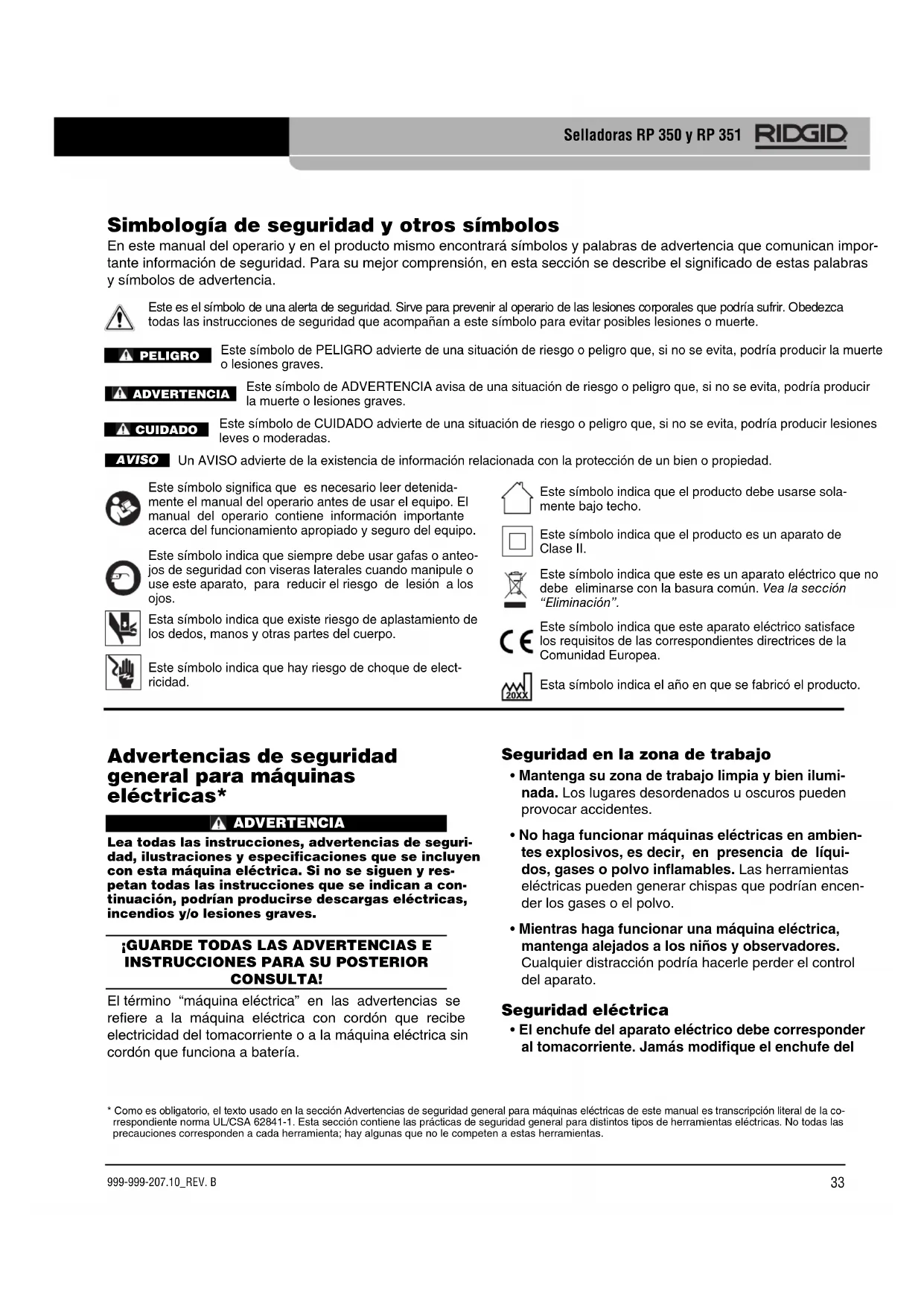 Sertisseuses RP 350 et RP 351 AVIS IMPORTANTSelladoras RP 350 y RP 351 Apunte aquí el número de serie del aparato, que se encuentra en su placa de características.Guarde el número de serie.N° de serie Selladoras RP 350/RP 351 ADVERTENCIA! Antes de utilizar este aparato, lea detenidamente su Manual del Operario. Pueden ocurrir descar- gas eléctricas, incendios y/o graves lesiones personales si no se entienden y siguen las instruc- ciones de este manual.999-995-220.10_REV. B