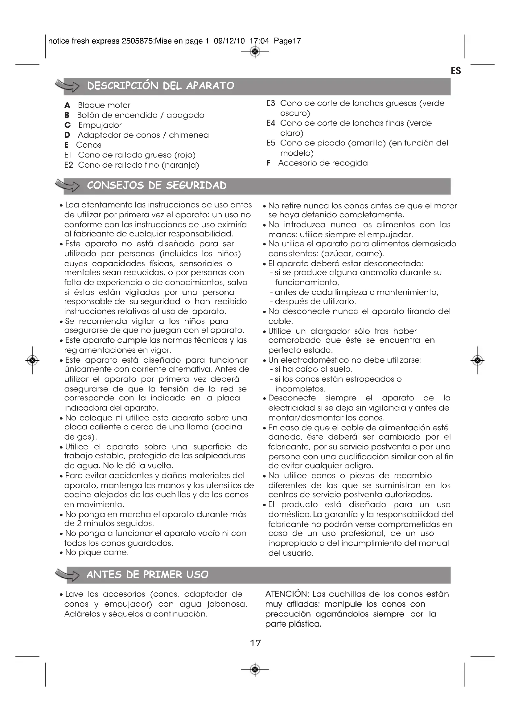 FIN DE LA VIDA ÚTIL DE UN PRODUCTO ELÉCTRICO O ELECTRÓNICO Su aparato está diseñado para funcionar durante muchos años. No obstante, el día que se plantee cambiarlo no lo tire a la basura ni a un contenedor, llévelo al punto de recogida de su municipio (o eventualmente, a un vertedero). ¡Contribuyamos a la protección del medio ambiente! Su aparato contiene un gran número de materiales aprovechables o reciclables. Deposítelo en un punto de recogida para que se lleve a cabo su tratamiento. notice fresh express 2505875:Mise en page 1 09/12/10 17:04 Page2021 A Blocco motore B Pulsante funzionamento inizio/stop C Pressino D Vano per coni / imboccatura E Coni