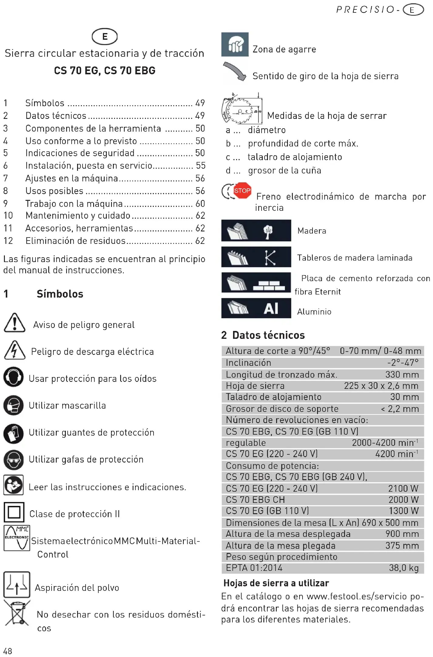 CS 70 EG (GB 110 V) 1300 W Dimensiones de la mesa (L x An) 690 x 500 mm Altura de la mesa desplegada 900 mm Altura de la mesa plegada 375 mm Peso según procedimiento EPTA 01:2014 38,0 kg Hojas de sierra a utilizar En el catálogo o en www.festool.es/servicio po- drá encontrar las hojas de sierra recomendadas para los diferentes materiales. Sierra circular estacionaria y de tracción