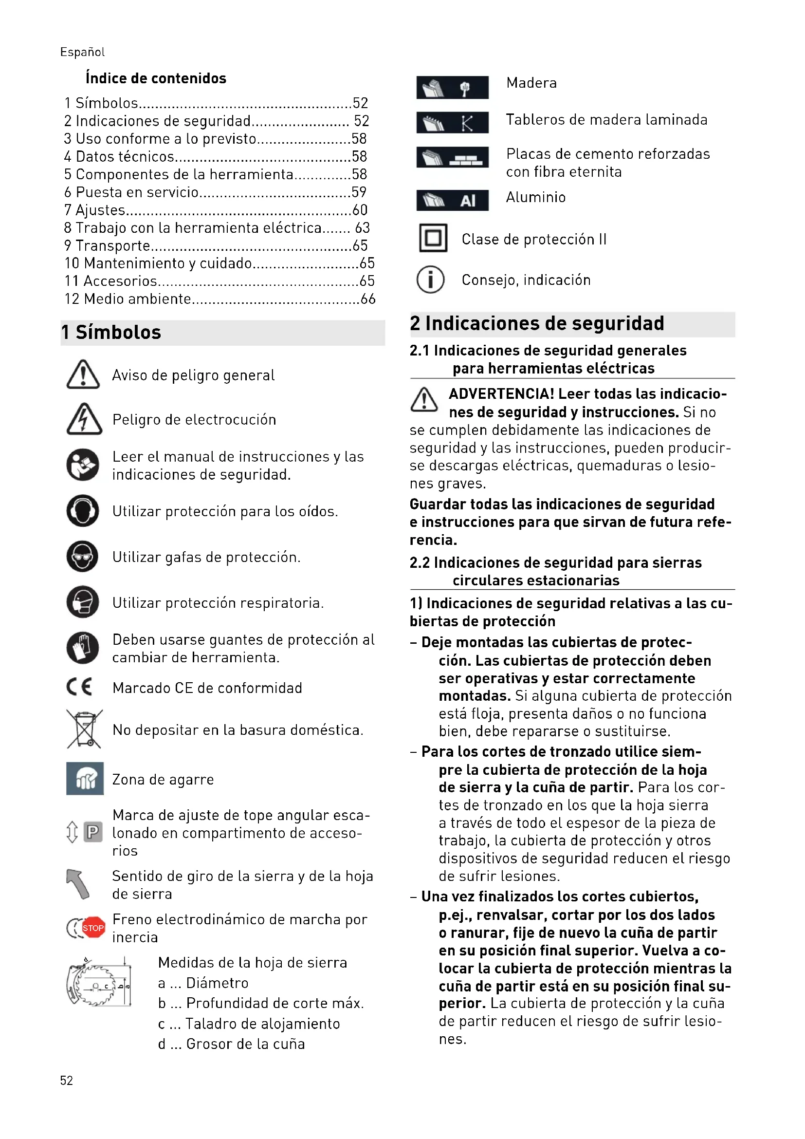 Medidas de la hoja de sierra a ... Diámetro b ... Profundidad de corte máx. c ... Taladro de alojamiento d ... Grosor de la cuña Madera Tableros de madera laminada Placas de cemento reforzadas con fibra eternita Aluminio Clase de protección II Consejo, indicación 2 Indicaciones de seguridad