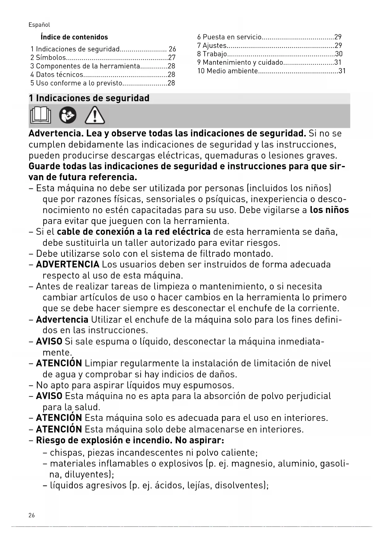 ATENCIÓN Polvos perjudiciales para la salud Daños en las vías respiratorias ► Después de aspirar en mojado, retirar el filtro para aspirar líquidos y sustituirlo por el filtro principal para sustancias secas. ATENCIÓN Salida de espuma y líquidos ► Desconectar inmediatamente la herra mienta y vaciarla.
