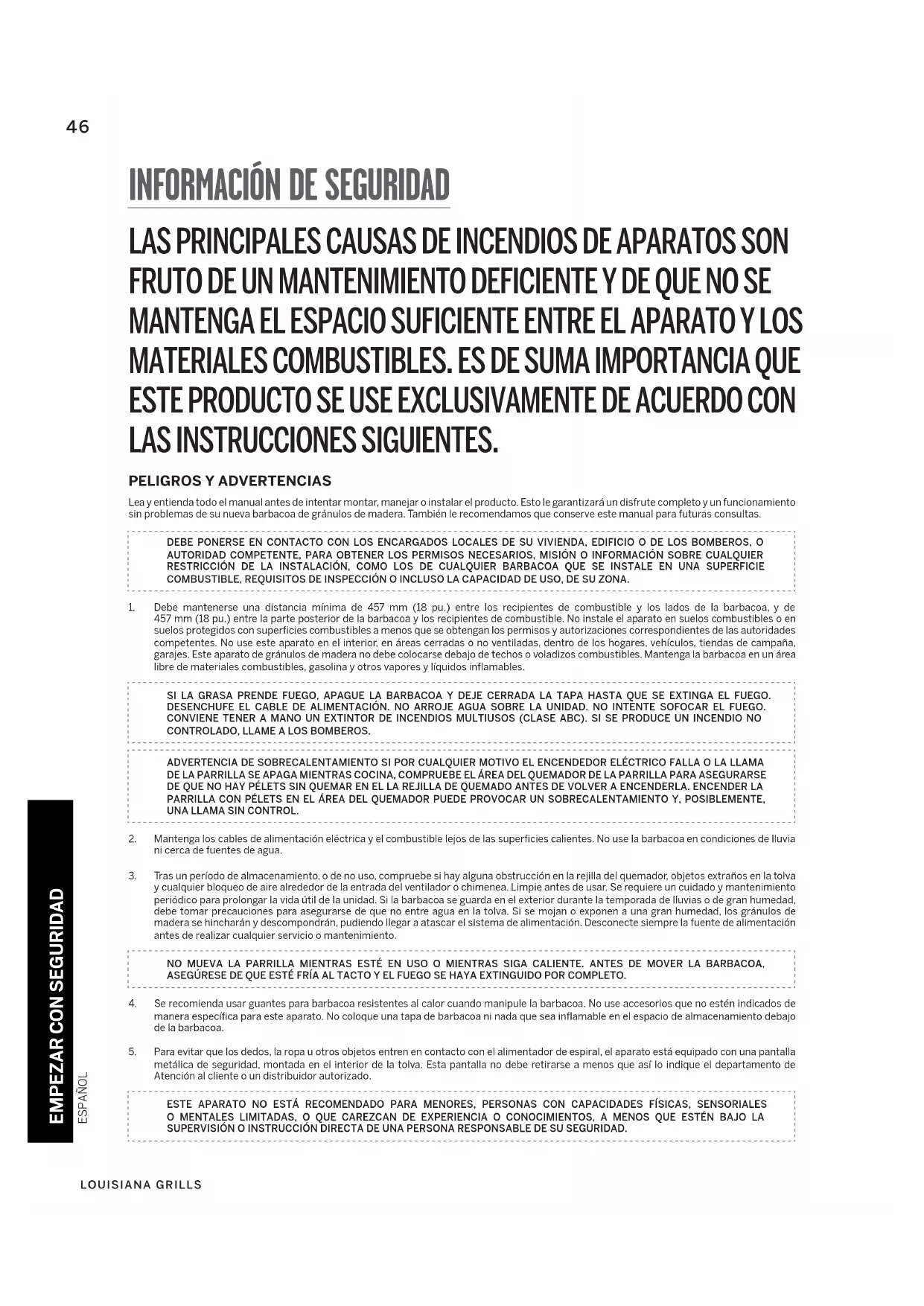 Lea y entienda todo el manual antes de intentar montar, manejar o instalar el producto. Esto le garantizará un disfrute completo y un funcionamiento sin problemas de su nueva barbacoa de gránulos de madera. También le recomendamos que conserve este manual para futuras consultas. DEBE PONERSE EN CONTACTO CON LOS ENCARGADOS LOCALES DE SU VIVIENDA, EDIFICIO O DE LOS BOMBEROS, O AUTORIDAD COMPETENTE, PARA OBTENER LOS PERMISOS NECESARIOS, MISIÓN O INFORMACIÓN SOBRE CUALQUIER RESTRICCIÓN DE LA INSTALACIÓN, COMO LOS DE CUALQUIER BARBACOA QUE SE INSTALE EN UNA SUPERFICIE COMBUSTIBLE, REQUISITOS DE INSPECCIÓN O INCLUSO LA CAPACIDAD DE USO, DE SU ZONA. 1. Debe mantenerse una distancia mínima de 457 mm (18 pu.) entre los recipientes de combustible y los lados de la barbacoa, y de 457 mm (18 pu.) entre la parte posterior de la barbacoa y los recipientes de combustible. No instale el aparato en suelos combustibles o en suelos protegidos con superficies combustibles a menos que se obtengan los permisos y autorizaciones correspondientes de las autoridades competentes. No use este aparato en el interior, en áreas cerradas o no ventiladas, dentro de los hogares, vehículos, tiendas de campaña, garajes. Este aparato de gránulos de madera no debe colocarse debajo de techos o voladizos combustibles. Mantenga la barbacoa en un área libre de materiales combustibles, gasolina y otros vapores y líquidos inflamables. SI LA GRASA PRENDE FUEGO, APAGUE LA BARBACOA Y DEJE CERRADA LA TAPA HASTA QUE SE EXTINGA EL FUEGO. DESENCHUFE EL CABLE DE ALIMENTACIÓN. NO ARROJE AGUA SOBRE LA UNIDAD. NO INTENTE SOFOCAR EL FUEGO. CONVIENE TENER A MANO UN EXTINTOR DE INCENDIOS MULTIUSOS (CLASE ABC). SI SE PRODUCE UN INCENDIO NO CONTROLADO, LLAME A LOS BOMBEROS.ADVERTENCIA DE SOBRECALENTAMIENTO SI POR CUALQUIER MOTIVO EL ENCENDEDOR ELÉCTRICO FALLA O LA LLAMA DE LA PARRILLA SE APAGA MIENTRAS COCINA, COMPRUEBE EL ÁREA DEL QUEMADOR DE LA PARRILLA PARA ASEGURARSE DE QUE NO HAY PÉLETS SIN QUEMAR EN EL LA REJILLA DE QUEMADO ANTES DE VOLVER A ENCENDERLA. ENCENDER LA PARRILLA CON PÉLETS EN EL ÁREA DEL QUEMADOR PUEDE PROVOCAR UN SOBRECALENTAMIENTO Y, POSIBLEMENTE, UNA LLAMA SIN CONTROL. 2. Mantenga los cables de alimentación eléctrica y el combustible lejos de las superficies calientes. No use la barbacoa en condiciones de lluvia ni cerca de fuentes de agua. 3. Tras un período de almacenamiento, o de no uso, compruebe si hay alguna obstrucción en la rejilla del quemador, objetos extraños en la tolva y cualquier bloqueo de aire alrededor de la entrada del ventilador o chimenea. Limpie antes de usar. Se requiere un cuidado y mantenimiento periódico para prolongar la vida útil de la unidad. Si la barbacoa se guarda en el exterior durante la temporada de lluvias o de gran humedad, debe tomar precauciones para asegurarse de que no entre agua en la tolva. Si se mojan o exponen a una gran humedad, los gránulos de madera se hincharán y descompondrán, pudiendo llegar a atascar el sistema de alimentación. Desconecte siempre la fuente de alimentación antes de realizar cualquier servicio o mantenimiento. NO MUEVA LA PARRILLA MIENTRAS ESTÉ EN USO O MIENTRAS SIGA CALIENTE. ANTES DE MOVER LA BARBACOA, ASEGÚRESE DE QUE ESTÉ FRÍA AL TACTO Y EL FUEGO SE HAYA EXTINGUIDO POR COMPLETO. 4. Se recomienda usar guantes para barbacoa resistentes al calor cuando manipule la barbacoa. No use accesorios que no estén indicados de manera específica para este aparato. No coloque una tapa de barbacoa ni nada que sea inflamable en el espacio de almacenamiento debajo de la barbacoa. 5. Para evitar que los dedos, la ropa u otros objetos entren en contacto con el alimentador de espiral, el aparato está equipado con una pantalla metálica de seguridad, montada en el interior de la tolva. Esta pantalla no debe retirarse a menos que así lo indique el departamento de Atención al cliente o un distribuidor autorizado. ESTE APARATO NO ESTÁ RECOMENDADO PARA MENORES, PERSONAS CON CAPACIDADES FÍSICAS, SENSORIALES O MENTALES LIMITADAS, O QUE CAREZCAN DE EXPERIENCIA O CONOCIMIENTOS, A MENOS QUE ESTÉN BAJO LA SUPERVISIÓN O INSTRUCCIÓN DIRECTA DE UNA PERSONA RESPONSABLE DE SU SEGURIDAD.47 www.louisiana-grills.com ESPAÑOL