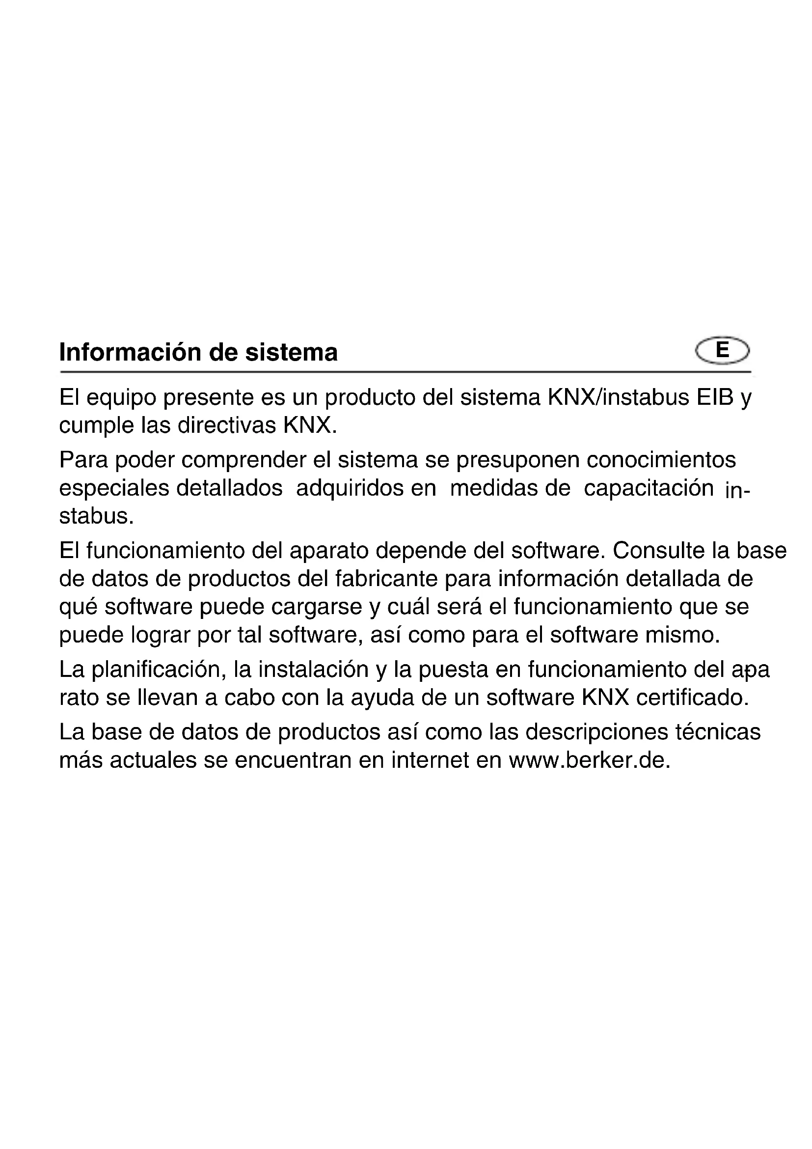 rato se llevan a cabo con la ayuda de un software KNX certificado. La base de datos de productos así como las descripciones técnicas más actuales se encuentran en internet en www.berker.de.Indicaciones de seguridad
