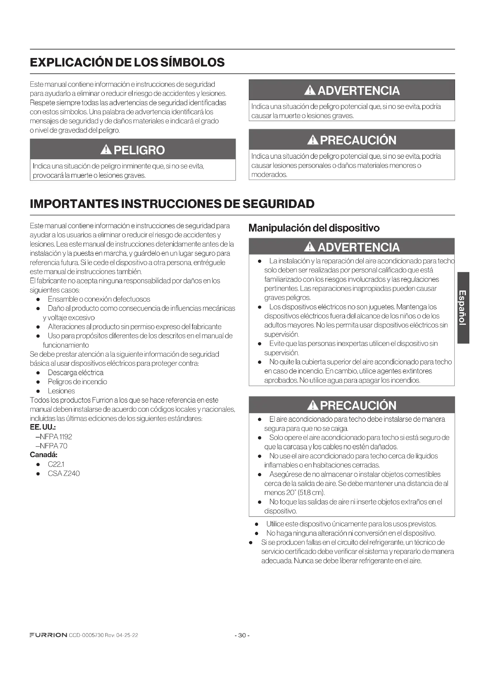 Este manual contiene información e instrucciones de seguridad para ayudar a los usuarios a eliminar o reducir el riesgo de accidentes y lesiones. Lea este manual de instrucciones detenidamente antes de la instalación y la puesta en marcha, y guárdelo en un lugar seguro para referencia futura. Si le cede el dispositivo a otra persona, entréguele este manual de instrucciones también. El fabricante no acepta ninguna responsabilidad por daños en los siguientes casos: ● Ensamble o conexión defectuosos ● Daño al producto como consecuencia de influencias mecánicas y voltaje excesivo ● Alteraciones al producto sin permiso expreso del fabricante ● Uso para propósitos diferentes de los descritos en el manual de funcionamiento Se debe prestar atención a la siguiente información de seguridad básica al usar dispositivos eléctricos para proteger contra: ● Descarga eléctrica ● Peligros de incendio ● Lesiones Todos los productos Furrion a los que se hace referencia en este manual deben instalarse de acuerdo con códigos locales y nacionales, incluidas las últimas ediciones de los siguientes estándares: EE.UU.: – NFPA 1192 – NFPA 70 Canadá: ● C22.1 ● CSA Z240 Manipulación del dispositivo ADVERTENCIA ● La instalación y la reparación del aire acondicionado para techo solo deben ser realizadas por personal calificado que está familiarizado con los riesgos involucrados y las regulaciones pertinentes. Las reparaciones inapropiadas pueden causar graves peligros. ● Los dispositivos eléctricos no son juguetes. Mantenga los dispositivos eléctricos fuera del alcance de los niños o de los adultos mayores. No les permita usar dispositivos eléctricos sin supervisión. ● Evite que las personas inexpertas utilicen el dispositivo sin supervisión. ● No quite la cubierta superior del aire acondicionado para techo en caso de incendio. En cambio, utilice agentes extintores aprobados. No utilice agua para apagar los incendios. PRECAUCIÓN ● El aire acondicionado para techo debe instalarse de manera segura para que no se caiga. ● Solo opere el aire acondicionado para techo si está seguro de que la carcasa y los cables no estén dañados. ● No use el aire acondicionado para techo cerca de líquidos inflamables o en habitaciones cerradas. ● Asegúrese de no almacenar o instalar objetos comestibles cerca de la salida de aire. Se debe mantener una distancia de al menos 20” (51,8cm). ● No toque las salidas de aire ni inserte objetos extraños en el dispositivo. ● Utilice este dispositivo únicamente para los usos previstos. ● No haga ninguna alteración ni conversión en el dispositivo. ● Si se producen fallas en el circuito del refrigerante, un técnico de servicio certificado debe verificar el sistema y repararlo de manera adecuada. Nunca se debe liberar refrigerante en el aire. Español CCD-0005730 Rev: 04-25-22 - 30 -Manipulación de cables eléctricos ADVERTENCIA Únicamente un electricista calificado puede conectar el suministro de energía. PRECAUCIÓN ● Consulte el Código Eléctrico Nacional (NEC) para conocer el calibre adecuado de los cables (CAE) según la longitud del cable y el valor nominal de protección contra sobrecorriente del cable que brinda alimentación al aire acondicionado. ● Consulte la placa de identificación de la unidad para el techo para conocer el tamaño adecuado de la protección contra sobrecorriente. ● Sujete y tienda los cables de manera tal que no se activen ni se dañen. ● Únicamente un electricista calificado debe conectar el aire acondicionado para techo a la energía eléctrica. ● No deje ningún cable suelto o doblado junto a materiales con conductividad eléctrica. ● No tire de los cables. ● Use canalización para cables para tenderlos por las paredes con bordes afilados. ● Consulte la placa de identificación de la unidad para el techo y el Código Eléctrico Nacional (National Electrical Code, NEC) para conocer el valor de suministro de energía.