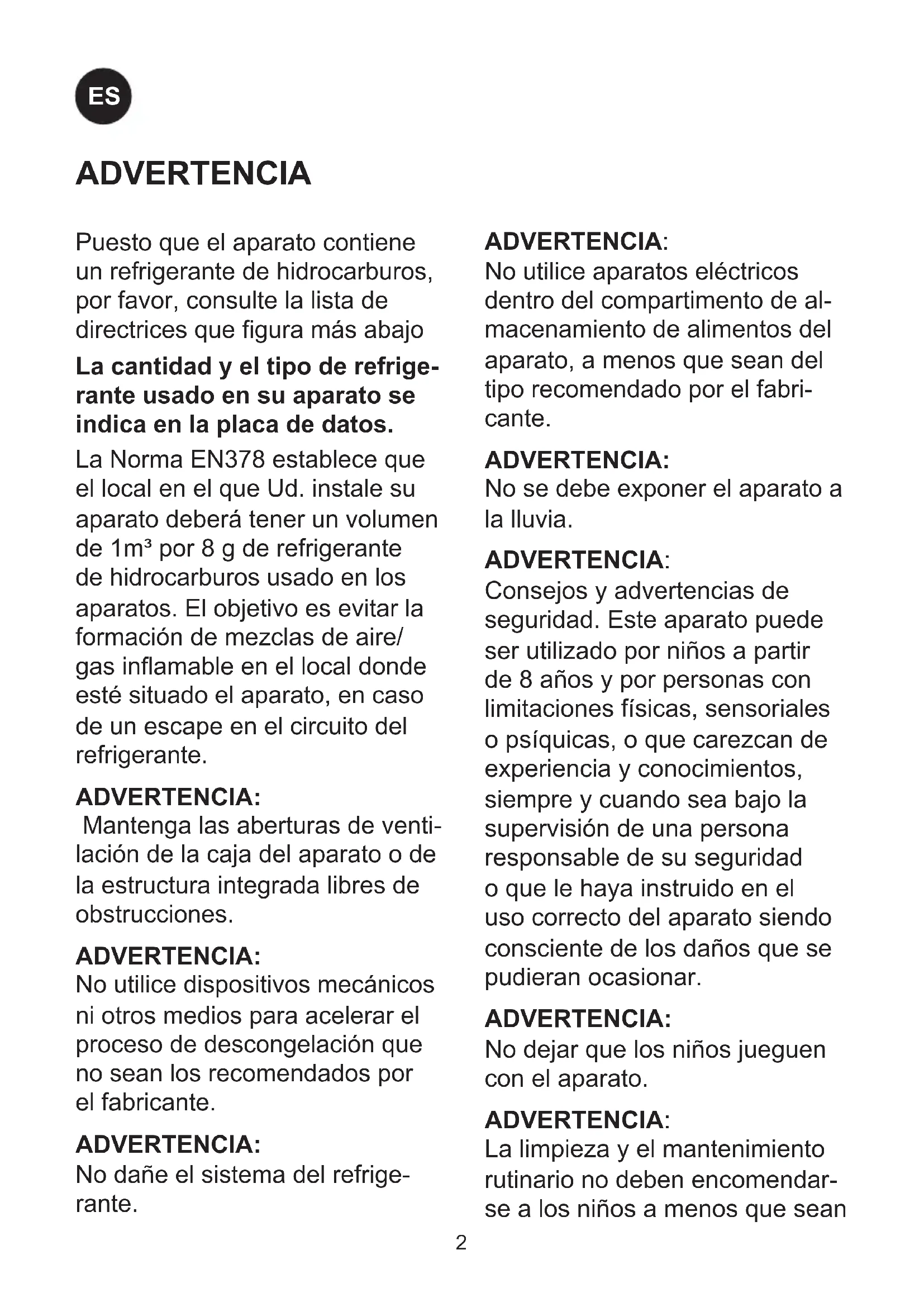 FRPuesto que el aparato contiene un refrigerante de hidrocarburos, por favor, consulte la lista de directrices que gura más abajo La cantidad y el tipo de refrige- rante usado en su aparato se indica en la placa de datos. La Norma EN378 establece que el local en el que Ud. instale su aparato deberá tener un volumen de 1m³ por 8 g de refrigerante de hidrocarburos usado en los aparatos. El objetivo es evitar la formación de mezclas de aire/ gas inamable en el local donde esté situado el aparato, en caso de un escape en el circuito del refrigerante. ADVERTENCIA: Mantenga las aberturas de venti- lación de la caja del aparato o de la estructura integrada libres de obstrucciones. ADVERTENCIA: No utilice dispositivos mecánicos ni otros medios para acelerar el proceso de descongelación que no sean los recomendados por el fabricante. ADVERTENCIA: No dañe el sistema del refrige- rante. ADVERTENCIA: No utilice aparatos eléctricos dentro del compartimento de al- macenamiento de alimentos del aparato, a menos que sean del tipo recomendado por el fabri- cante. ADVERTENCIA: No se debe exponer el aparato a la lluvia. ADVERTENCIA: Consejos y advertencias de seguridad. Este aparato puede ser utilizado por niños a partir de 8 años y por personas con limitaciones físicas, sensoriales o psíquicas, o que carezcan de experiencia y conocimientos, siempre y cuando sea bajo la supervisión de una persona responsable de su seguridad o que le haya instruido en el uso correcto del aparato siendo consciente de los daños que se pudieran ocasionar. ADVERTENCIA: No dejar que los niños jueguen con el aparato. ADVERTENCIA: La limpieza y el mantenimiento rutinario no deben encomendar- se a los niños a menos que sean ADVERTENCIA