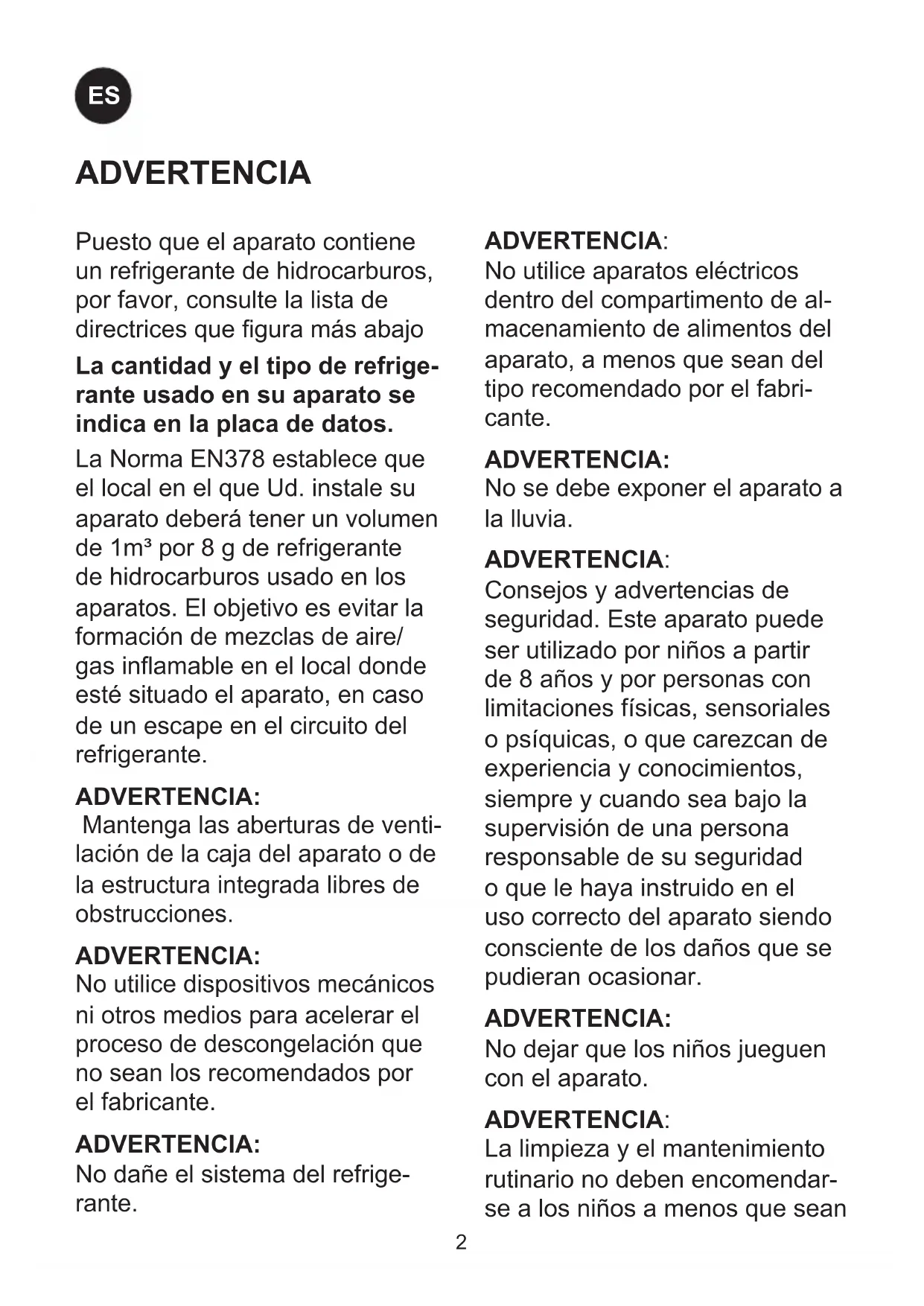 FRPuesto que el aparato contiene un refrigerante de hidrocarburos, por favor, consulte la lista de directrices que gura más abajo La cantidad y el tipo de refrige- rante usado en su aparato se indica en la placa de datos. La Norma EN378 establece que el local en el que Ud. instale su aparato deberá tener un volumen de 1m³ por 8 g de refrigerante de hidrocarburos usado en los aparatos. El objetivo es evitar la formación de mezclas de aire/ gas inamable en el local donde esté situado el aparato, en caso de un escape en el circuito del refrigerante. ADVERTENCIA: Mantenga las aberturas de venti- lación de la caja del aparato o de la estructura integrada libres de obstrucciones. ADVERTENCIA: No utilice dispositivos mecánicos ni otros medios para acelerar el proceso de descongelación que no sean los recomendados por el fabricante. ADVERTENCIA: No dañe el sistema del refrige- rante. ADVERTENCIA: No utilice aparatos eléctricos dentro del compartimento de al- macenamiento de alimentos del aparato, a menos que sean del tipo recomendado por el fabri- cante. ADVERTENCIA: No se debe exponer el aparato a la lluvia. ADVERTENCIA: Consejos y advertencias de seguridad. Este aparato puede ser utilizado por niños a partir de 8 años y por personas con limitaciones físicas, sensoriales o psíquicas, o que carezcan de experiencia y conocimientos, siempre y cuando sea bajo la supervisión de una persona responsable de su seguridad o que le haya instruido en el uso correcto del aparato siendo consciente de los daños que se pudieran ocasionar. ADVERTENCIA: No dejar que los niños jueguen con el aparato. ADVERTENCIA: La limpieza y el mantenimiento rutinario no deben encomendar- se a los niños a menos que sean ADVERTENCIA