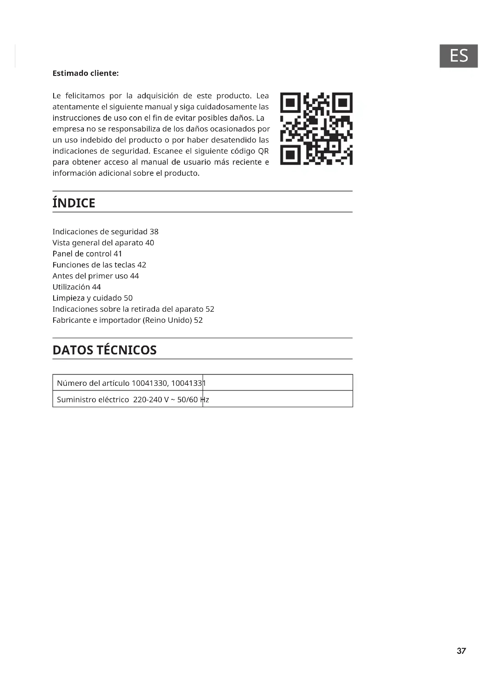 Estimado cliente: Le felicitamos por la adquisición de este producto. Lea atentamente el siguiente manual y siga cuidadosamente las instrucciones de uso con el n de evitar posibles daños. La empresa no se responsabiliza de los daños ocasionados por un uso indebido del producto o por haber desatendido las indicaciones de seguridad. Escanee el siguiente código QR para obtener acceso al manual de usuario más reciente e información adicional sobre el producto. ÍNDICE Indicaciones de seguridad 38 Vista general del aparato 40 Panel de control 41 Funciones de las teclas 42 Antes del primer uso 44 Utilización 44 Limpieza y cuidado 50 Indicaciones sobre la retirada del aparato 52 Fabricante e importador (Reino Unido) 52