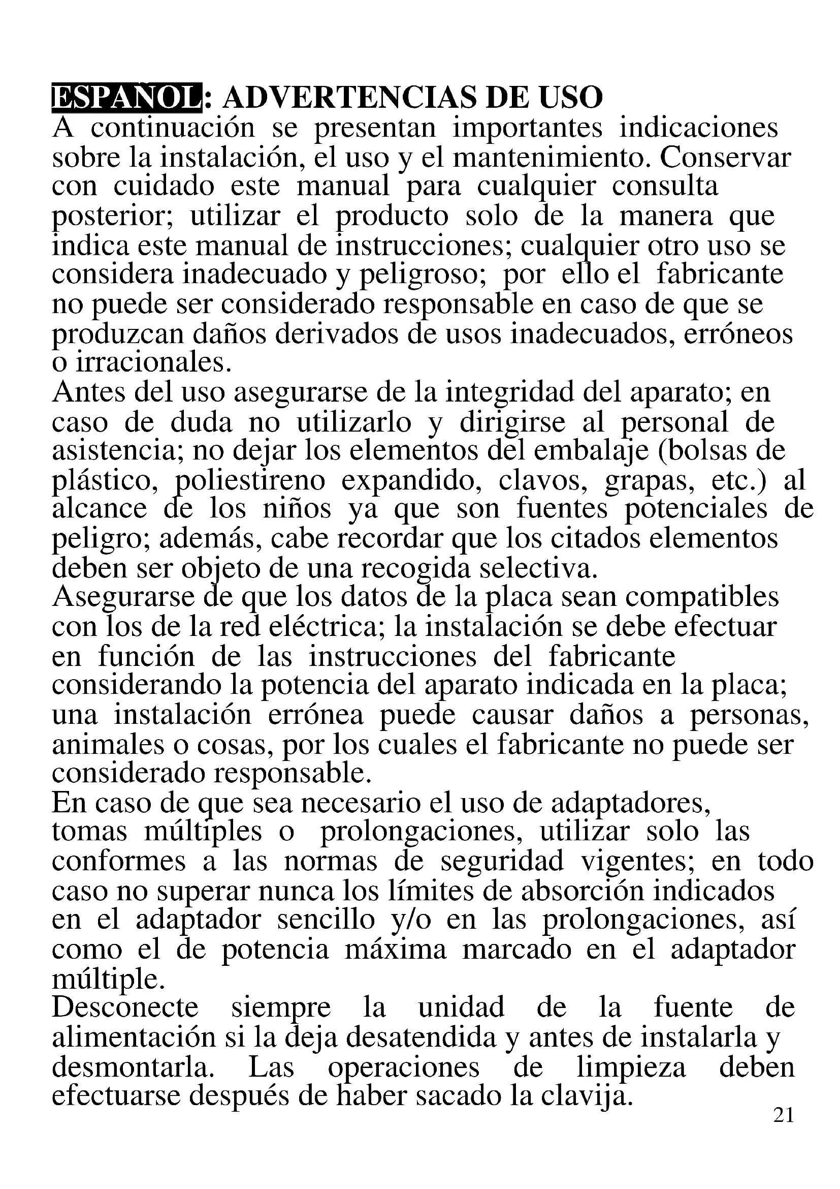 ESPAÑOL: ADVERTENCIAS DE USO