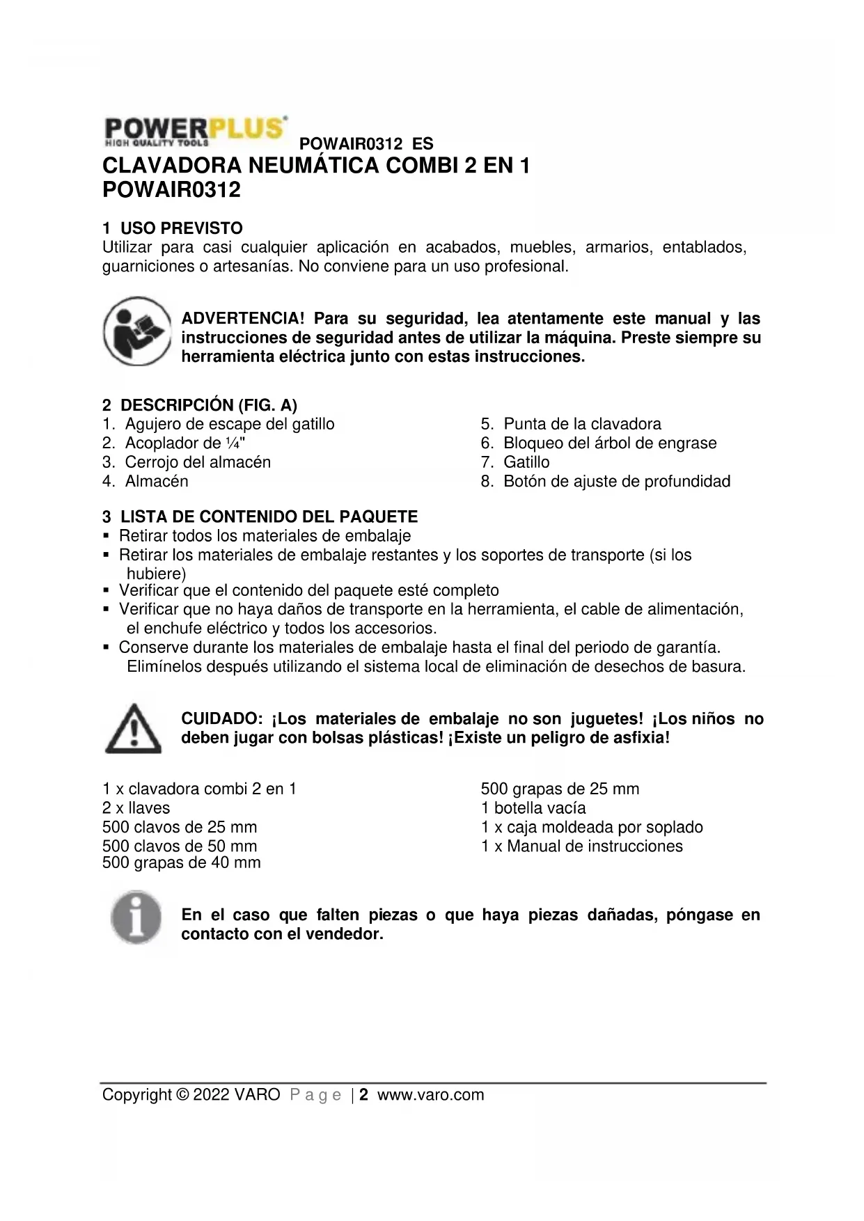 de trabajo y tirar el gatilloPOWAIR0312 ES Copyright © 2022 VARO P a g e | 8 www.varo.com