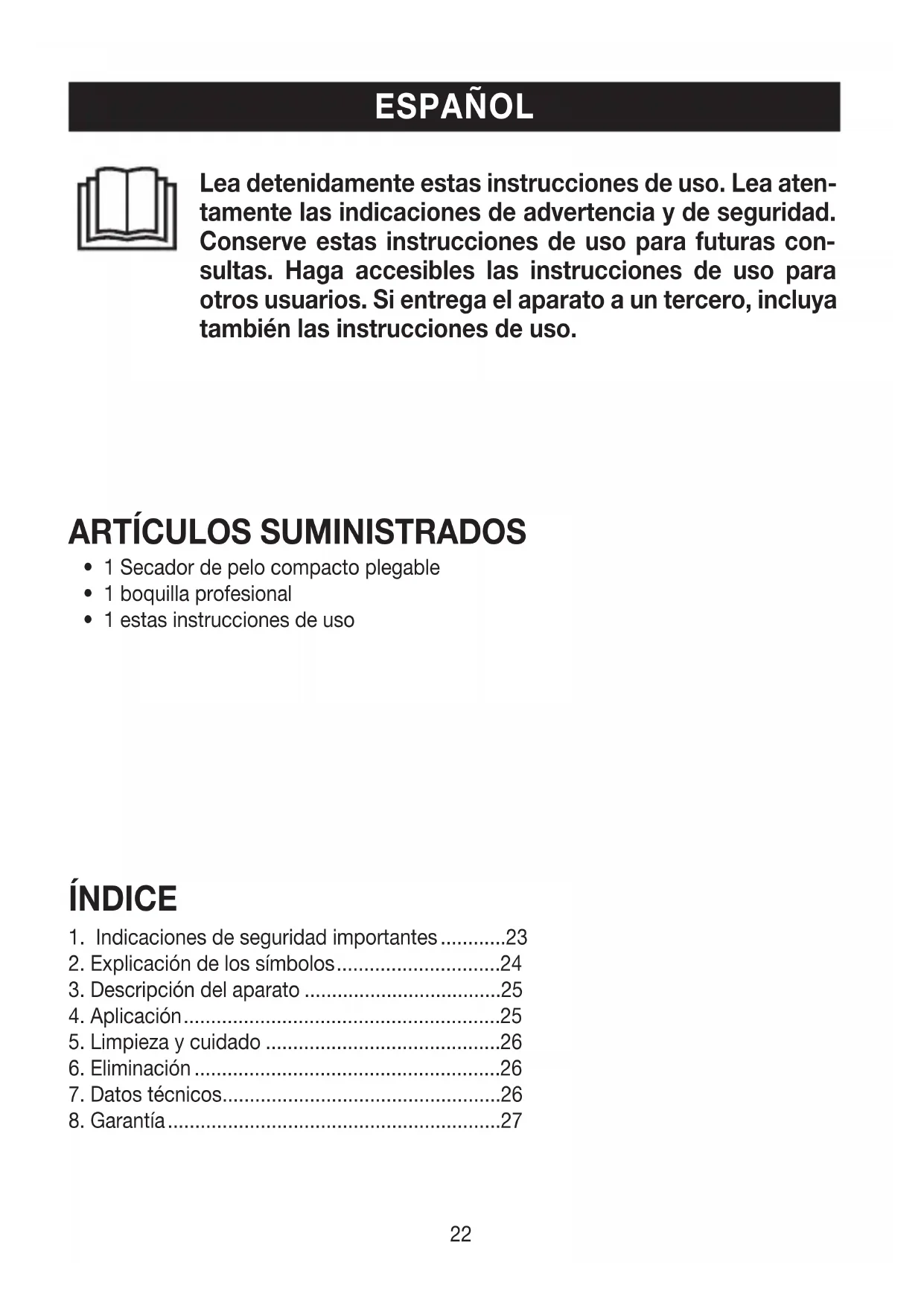 Pour plus d’informations sur la garantie et les conditions de garantie, veuillez consulter la fiche de garantie fournie. Sous réserve d’erreurs et de modifications22 ESPAÑOL Lea detenidamente estas instrucciones de uso. Lea aten- tamente las indicaciones de advertencia y de seguridad. Conserve estas instrucciones de uso para futuras con