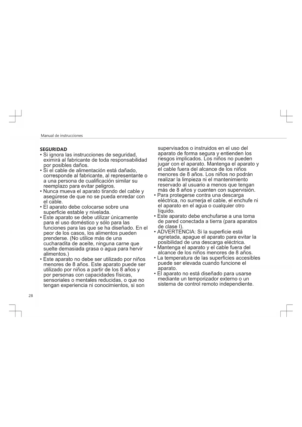- Este aparato no debe ser utilizado por niños menores de 8 años. Este aparato puede ser utilizado por niños a partir de los 8 años y por personas con capacidades físicas, sensoriales o mentales reducidas, o que no tengan experiencia ni conocimientos, si son supervisados o instruidos en el uso del aparato de forma segura y entienden los riesgos implicados. Los niños no pueden jugar con el aparato. Mantenga el aparato y el cable fuera del alcance de los niños menores de 8 años. Los niños no podrán realizar la limpieza ni el mantenimiento reservado al usuario a menos que tengan más de 8 años y cuenten con supervisión.