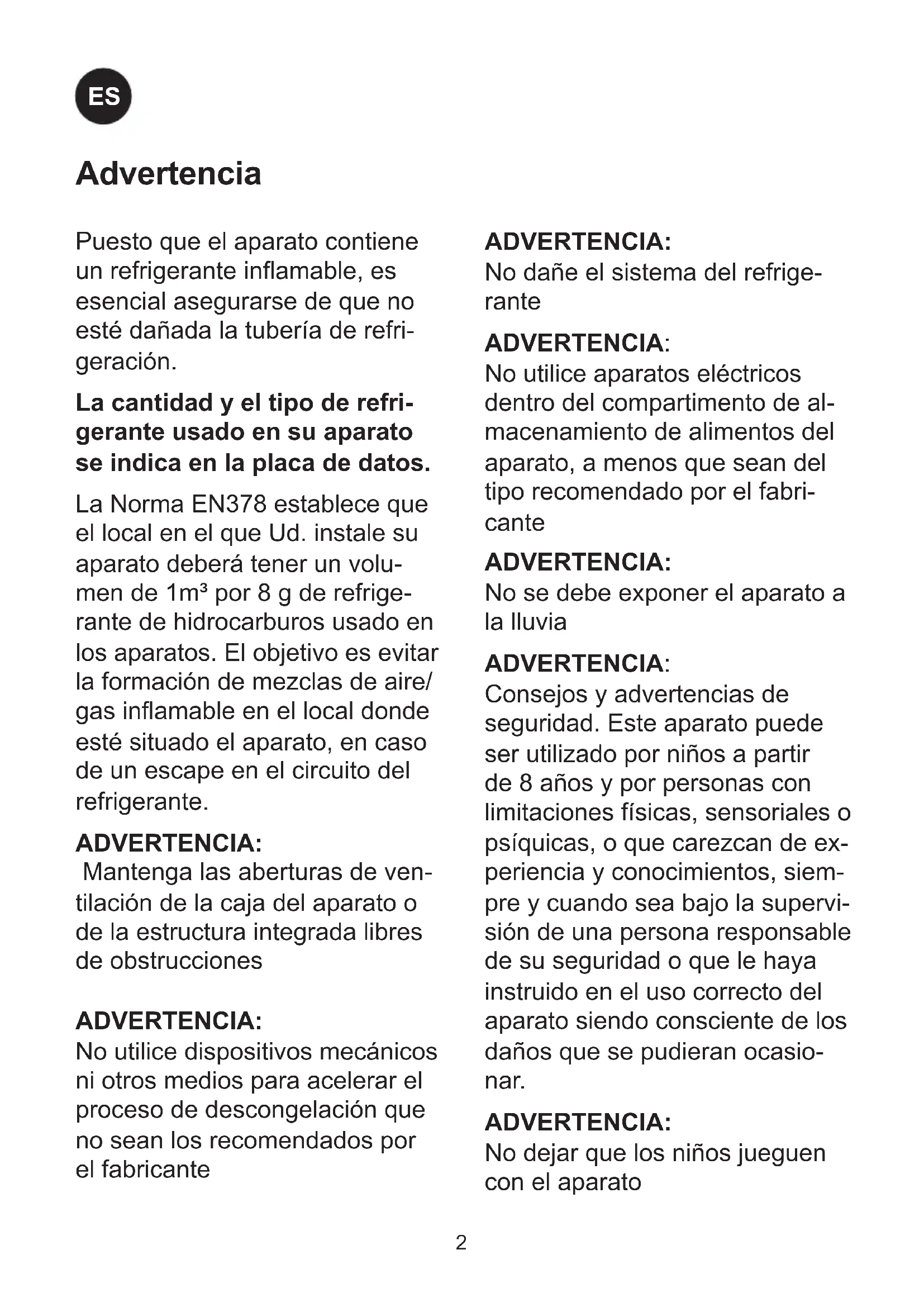 FRADVERTENCIA: No dañe el sistema del refrige- rante ADVERTENCIA: No utilice aparatos eléctricos dentro del compartimento de al- macenamiento de alimentos del aparato, a menos que sean del tipo recomendado por el fabri- cante ADVERTENCIA: No se debe exponer el aparato a la lluvia ADVERTENCIA: Consejos y advertencias de seguridad. Este aparato puede ser utilizado por niños a partir de 8 años y por personas con limitaciones físicas, sensoriales o psíquicas, o que carezcan de ex- periencia y conocimientos, siem- pre y cuando sea bajo la supervi- sión de una persona responsable de su seguridad o que le haya instruido en el uso correcto del aparato siendo consciente de los daños que se pudieran ocasio- nar. ADVERTENCIA: No dejar que los niños jueguen con el aparato Puesto que el aparato contiene un refrigerante inamable, es esencial asegurarse de que no esté dañada la tubería de refri- geración. La cantidad y el tipo de refri- gerante usado en su aparato se indica en la placa de datos. La Norma EN378 establece que el local en el que Ud. instale su aparato deberá tener un volu- men de 1m³ por 8 g de refrige- rante de hidrocarburos usado en los aparatos. El objetivo es evitar la formación de mezclas de aire/ gas inamable en el local donde esté situado el aparato, en caso de un escape en el circuito del refrigerante. ADVERTENCIA: Mantenga las aberturas de ven- tilación de la caja del aparato o de la estructura integrada libres de obstrucciones ADVERTENCIA: No utilice dispositivos mecánicos ni otros medios para acelerar el proceso de descongelación que no sean los recomendados por el fabricante Advertencia