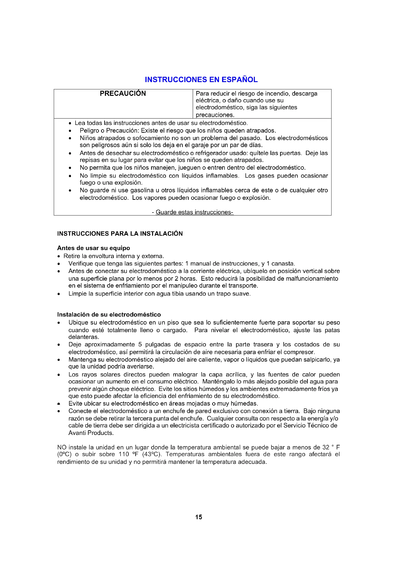 - Conecte el electrodoméstico a un enchufe de pared exclusivo con conexión a tierra. Bajo ninguna razón se debe retirar la tercera punta del enchufe. Cualquier consulta con respecto a la energía y/o cable de tierra debe ser dirigida a un electricista certificado o autorizado por el Servicio Técnico de Avanti Products. NO instale la unidad en un lugar donde la temperatura ambiental se puede bajar a menos de 32 ° F (0ºC) o subir sobre 110 ºF (43ºC). Temperaturas ambientales fuera de este rango afectará el rendimiento de su unidad y no permitirá mantener la temperatura adecuada.