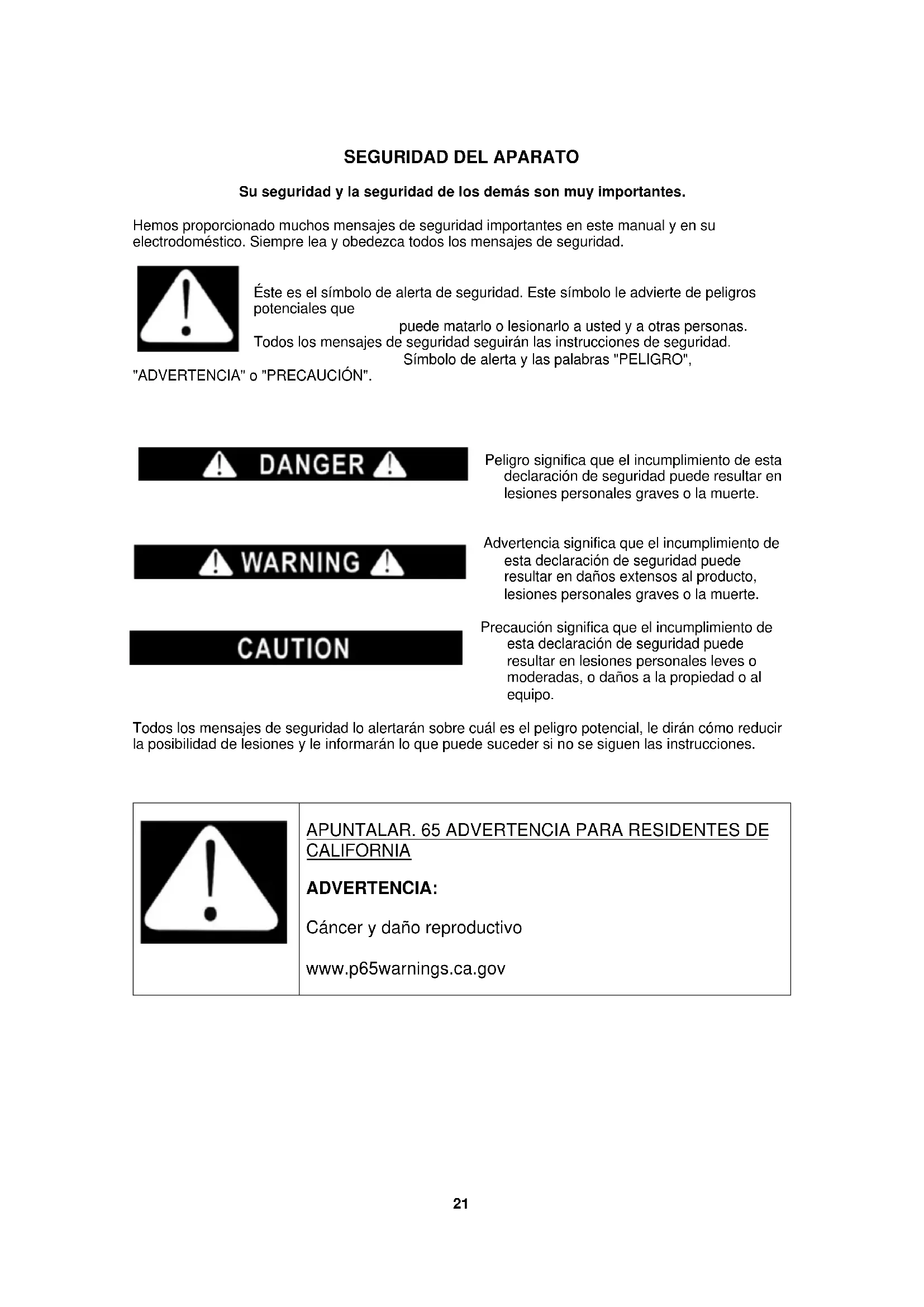 Su seguridad y la seguridad de los demás son muy importantes. Hemos proporcionado muchos mensajes de seguridad importantes en este manual y en su electrodoméstico. Siempre lea y obedezca todos los mensajes de seguridad.
