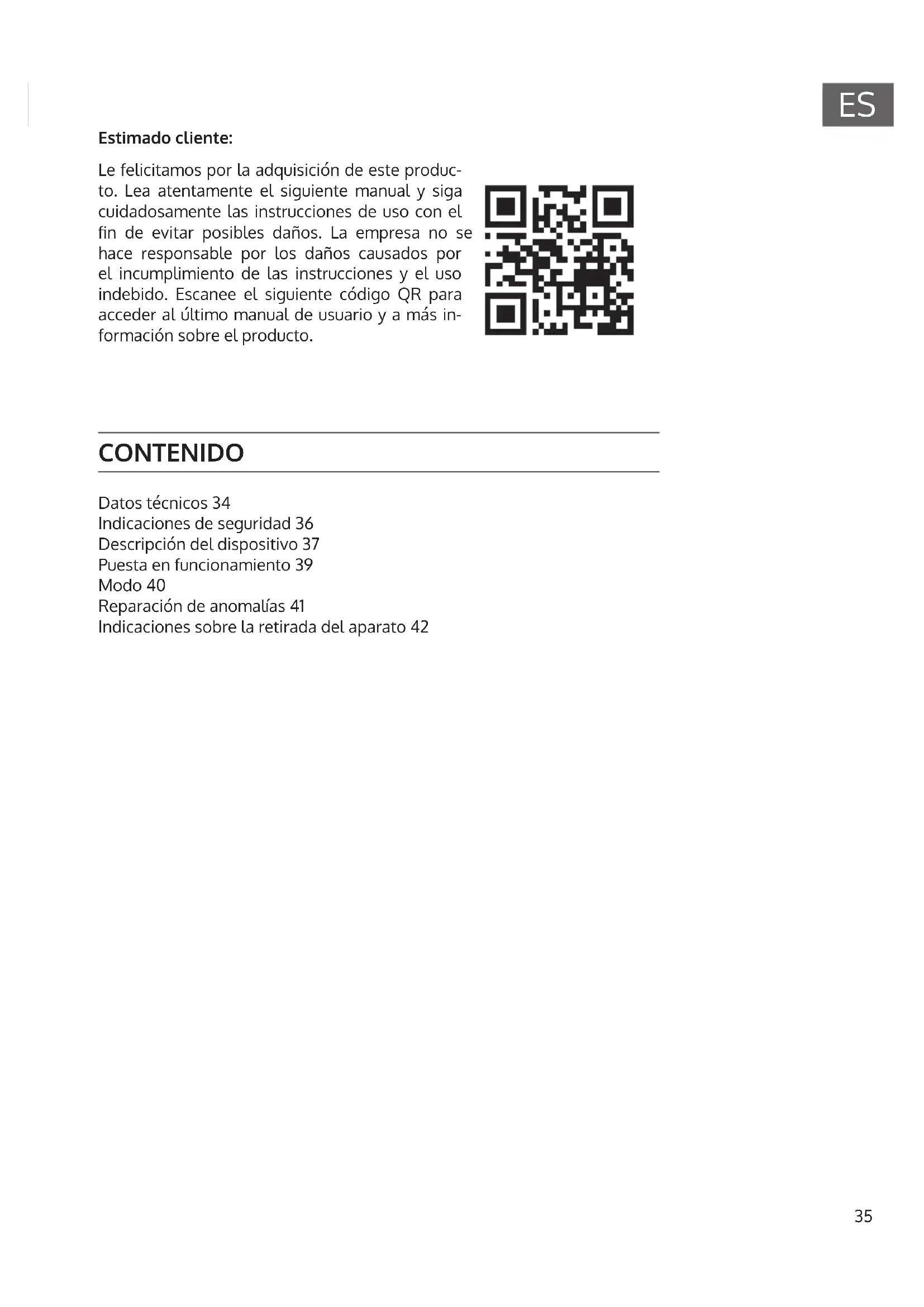 CONTENIDO Datos técnicos 34 Indicaciones de seguridad 36 Descripción del dispositivo 37 Puesta en funcionamiento 39 Modo 40 Reparación de anomalías 41 Indicaciones sobre la retirada del aparato 42 Estimado cliente: Le felicitamos por la adquisición de este produc- to. Lea atentamente el siguiente manual y siga cuidadosamente las instrucciones de uso con el n de evitar posibles daños. La empresa no se hace responsable por los daños causados por el incumplimiento de las instrucciones y el uso indebido. Escanee el siguiente código QR para acceder al último manual de usuario y a más in- formación sobre el producto.36