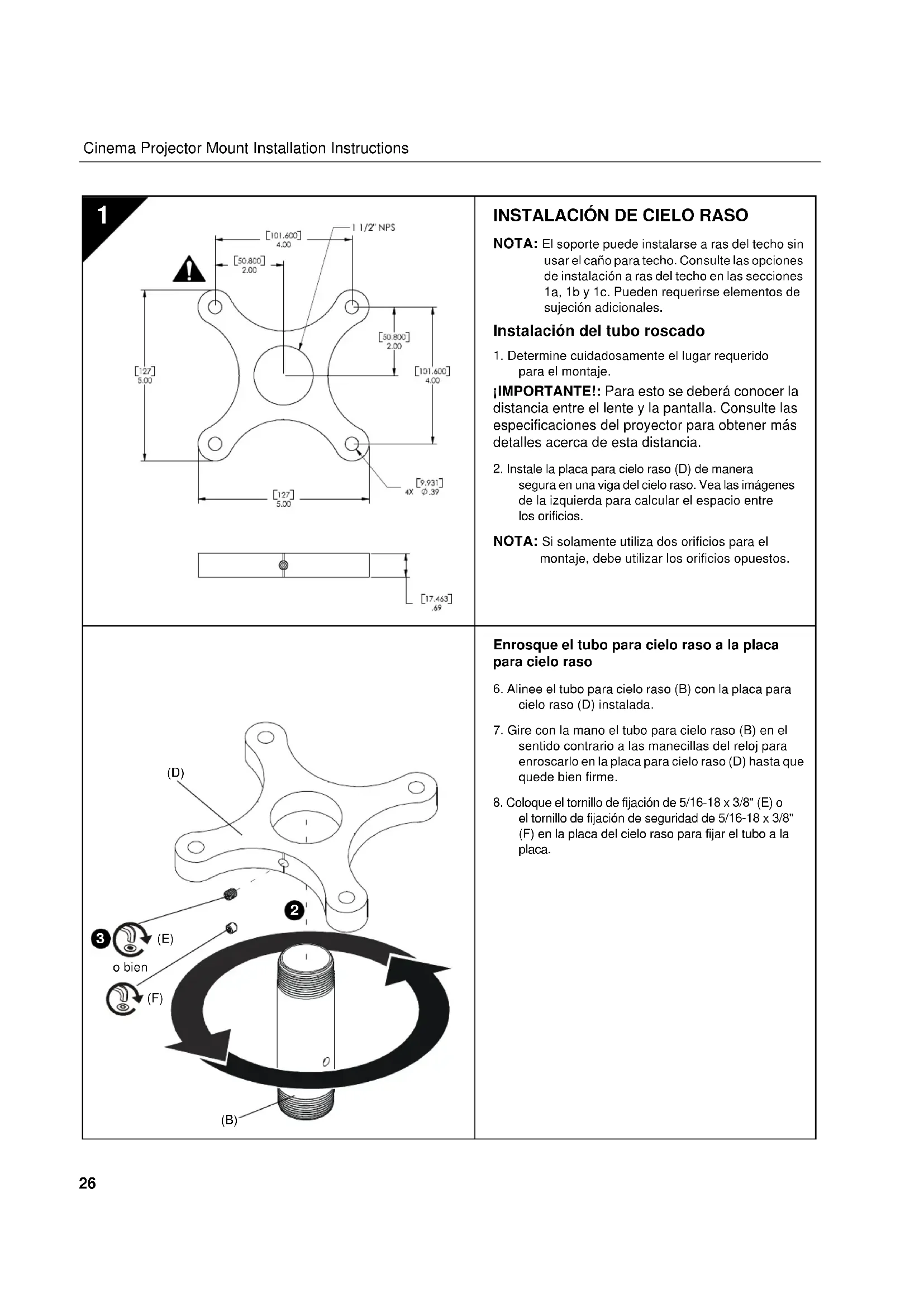 AVISOS y PRECAUCIONES IMPORTANTES! AVISO: Un AVISO llama su atención sobre la posibilidad de sufrir lesiones de gravedad o incluso mortales si no sigue las instrucciones. PRECAUCIÓN: Una not de PRECAUCIÓN llama su atención sobre la posibilidad de dañar o destruir el equipo si no sigue las instrucciones. AVISO: Si no lee, comprende perfectamente y sigue todas las instrucciones, podría causar daños graves daños personales y materiales o anular la garantía de fábrica. El instalador es el responsable de asegurarse de que todos los componentes están correctamente montados e instalados siguiendo las instrucciones indicadas.Installation Instructions Cinema Projector Mount