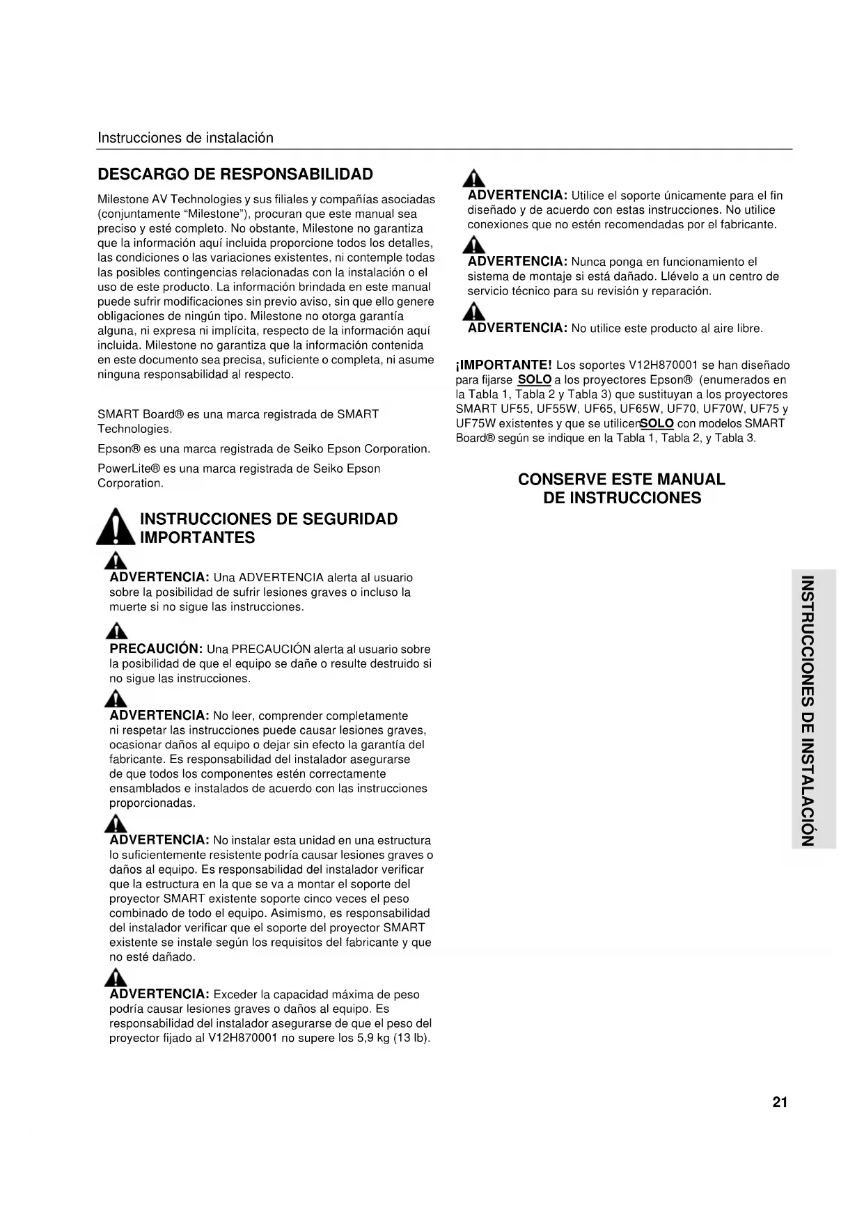 IMPORTANTES ADVERTENCIA: Una ADVERTENCIA alerta al usuario sobre la posibilidad de sufrir lesiones graves o incluso la muerte si no sigue las instrucciones. PRECAUCIÓN: Una PRECAUCIÓN alerta al usuario sobre la posibilidad de que el equipo se dañe o resulte destruido si no sigue las instrucciones. ADVERTENCIA: No leer, comprender completamente ni respetar las instrucciones puede causar lesiones graves, ocasionar daños al equipo o dejar sin efecto la garantía del fabricante. Es responsabilidad del instalador asegurarse de que todos los componentes estén correctamente ensamblados e instalados de acuerdo con las instrucciones proporcionadas. ADVERTENCIA: No instalar esta unidad en una estructura lo suficientemente resistente podría causar lesiones graves o daños al equipo. Es responsabilidad del instalador verificar que la estructura en la que se va a montar el soporte del proyector SMART existente soporte cinco veces el peso combinado de todo el equipo. Asimismo, es responsabilidad del instalador verificar que el soporte del proyector SMART existente se instale según los requisitos del fabricante y que no esté dañado. ADVERTENCIA: Exceder la capacidad máxima de peso podría causar lesiones graves o daños al equipo. Es responsabilidad del instalador asegurarse de que el peso del proyector fijado al V12H870001 no supere los 5,9 kg (13 lb). ADVERTENCIA: Utilice el soporte únicamente para el fin diseñado y de acuerdo con estas instrucciones. No utilice conexiones que no estén recomendadas por el fabricante. ADVERTENCIA: Nunca ponga en funcionamiento el sistema de montaje si está dañado. Llévelo a un centro de servicio técnico para su revisión y reparación. ADVERTENCIA: No utilice este producto al aire libre. ¡IMPORTANTE! Los soportes V12H870001 se han diseñado para fijarse SOLO a los proyectores Epson® (enumerados en la Tabla 1, Tabla 2 y Tabla 3) que sustituyan a los proyectores SMART UF55, UF55W, UF65, UF65W, UF70, UF70W, UF75 y UF75W existentes y que se utilicen SOLO con modelos SMART Board® según se indique en la Tabla 1, Tabla 2, y Tabla 3.