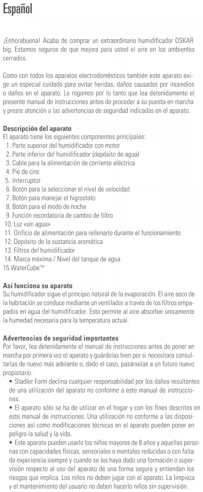 Así funciona su aparato Su humidificador sigue el principio natural de la evaporación. El aire seco de la habitación se conduce mediante un ventilador a través de los filtros empa- pados en agua del humidificador. Esto permite al aire absorber únicamente la humedad necesaria para la temperatura actual. Advertencias de seguridad importantes Por favor, lea detenidamente el manual de instrucciones antes de poner en marcha por primera vez el aparato y guárdelas bien por si necesitara consul- tarlas de nuevo más adelante o, dado el caso, pasárselas a un futuro nuevo propietario.