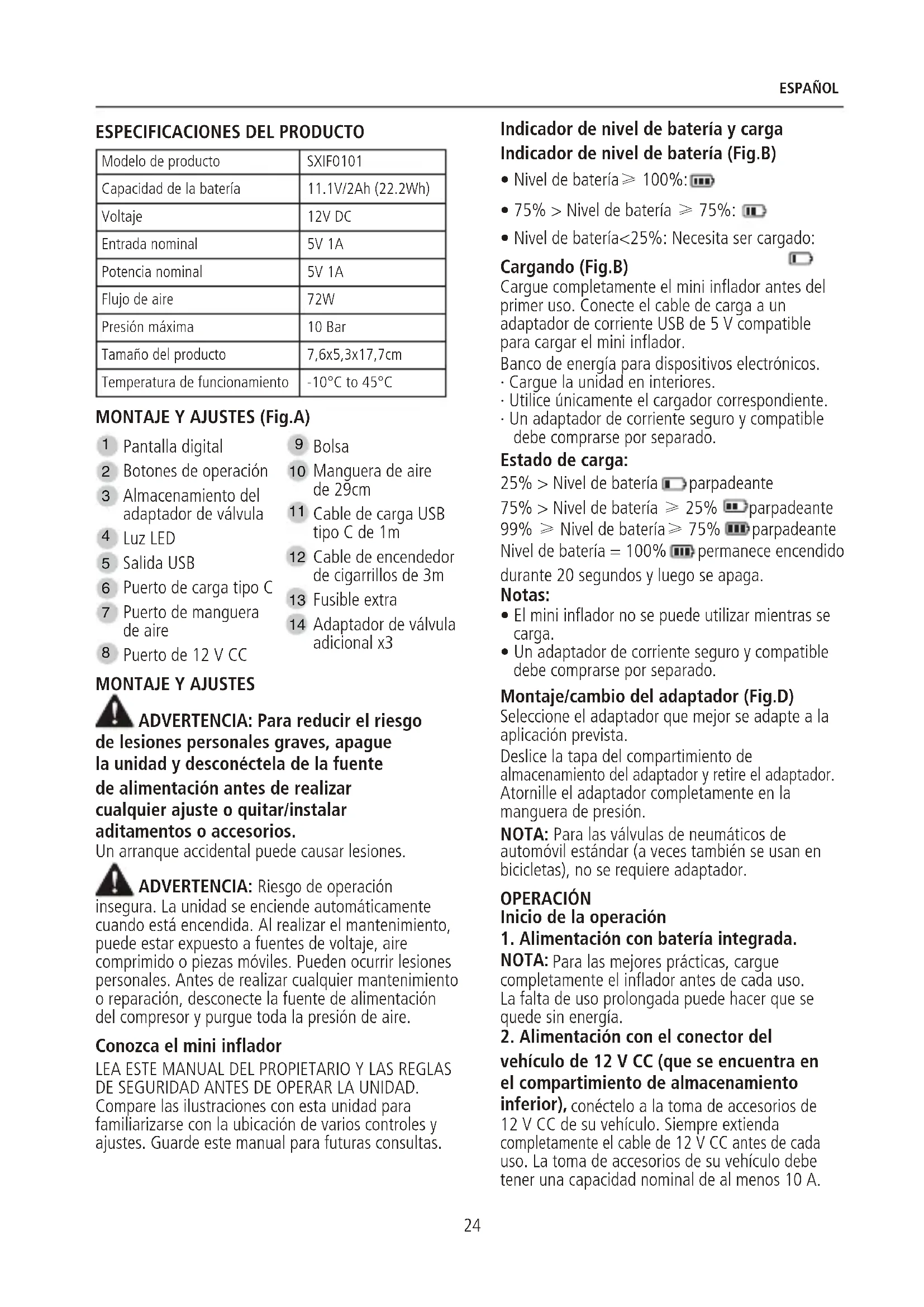 MONTAJE Y AJUSTES (Fig.A) ADVERTENCIA: Para reducir el riesgo de lesiones personales graves, apague la unidad y desconéctela de la fuente de alimentación antes de realizar cualquier ajuste o quitar/instalar aditamentos o accesorios. ADVERTENCIA: Riesgo de operación insegura. La unidad se enciende automáticamente cuando está encendida. Al realizar el mantenimiento, puede estar expuesto a fuentes de voltaje, aire comprimido o piezas móviles. Pueden ocurrir lesiones personales. Antes de realizar cualquier mantenimiento o reparación, desconecte la fuente de alimentación del compresor y purgue toda la presión de aire. LEA ESTE MANUAL DEL PROPIETARIO Y LAS REGLAS DE SEGURIDAD ANTES DE OPERAR LA UNIDAD. Compare las ilustraciones con esta unidad para familiarizarse con la ubicación de varios controles y ajustes. Guarde este manual para futuras consultas. Un arranque accidental puede causar lesiones. Conozca el mini inflador Cargando (Fig.B) Estado de carga: Notas: 25% > Nivel de batería parpadeante 75% > Nivel de batería ≥ 25% parpadeante 99% ≥ Nivel de batería≥ 75% parpadeante Nivel de batería = 100% permanece encendido durante 20 segundos y luego se apaga.