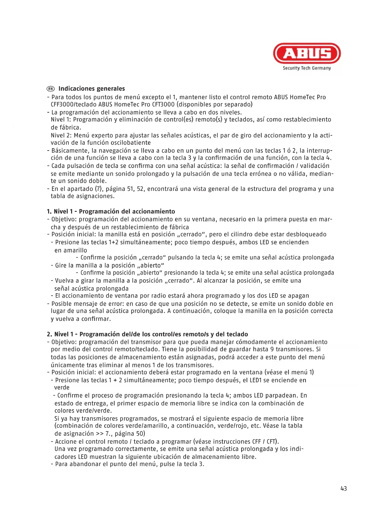 - Se è stata selezionata questa impostazione, azionando il trasmettitore al tasto „Aprire“ la nestrapasseràdallaposizioneribaltataallaposizione„aperta“.Allostessotemposideve sempreaccompagnarelanestraamano! Quando si utilizza il meccanismo di ribaltamento accompagnare sempre la finestra con una mano prima dell’azionamento dell’attuatore finché l’attuatore non ha raggiunto la posizione di riposo! Inparticolareconnestreeportenestremenorecentisussisteil rischiochel‘antadellanestravengasollevatadall‘ancoraggio,amenochenonsiaaccom- pagnare completamente.43 Indicaciones generales - Para todos los puntos de menú excepto el 1, mantener listo el control remoto ABUS HomeTec Pro CFF3000/teclado ABUS HomeTec Pro CFT3000 (disponibles por separado) - La programación del accionamiento se lleva a cabo en dos niveles. Nivel 1: Programación y eliminación de control(es) remoto(s) y teclados, así como restablecimiento de fábrica. Nivel 2: Menú experto para ajustar las señales acústicas, el par de giro del accionamiento y la acti- vación de la función oscilobatiente - Básicamente, la navegación se lleva a cabo en un punto del menú con las teclas 1 ó 2, la interrup- cióndeunafunciónsellevaacaboconlatecla3ylaconrmacióndeunafunción,conlatecla4. -Cadapulsacióndeteclaseconrmaconunaseñalacústica:laseñaldeconrmación/validación se emite mediante un sonido prolongado y la pulsación de una tecla errónea o no válida, median- te un sonido doble. - En el apartado (7), página 51, 52, encontrará una vista general de la estructura del programa y una tabla de asignaciones.
