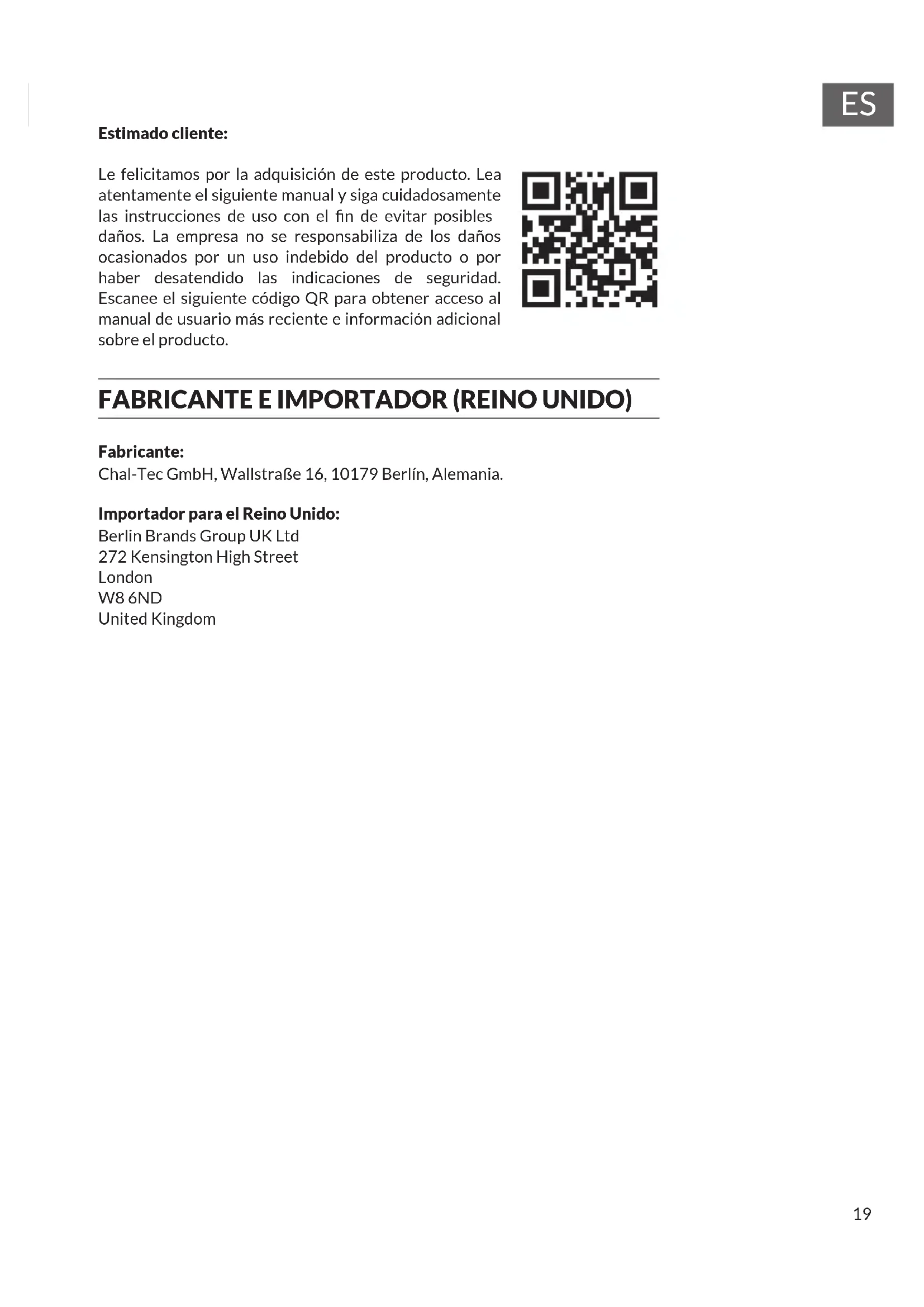 Estimado cliente: Le felicitamos por la adquisición de este producto. Lea atentamente el siguiente manual y siga cuidadosamente las instrucciones de uso con el n de evitar posibles daños. La empresa no se responsabiliza de los daños ocasionados por un uso indebido del producto o por haber desatendido las indicaciones de seguridad. Escanee el siguiente código QR para obtener acceso al manual de usuario más reciente e información adicional sobre el producto. FABRICANTE E IMPORTADOR (REINO UNIDO) Fabricante: Chal-Tec GmbH, Wallstraße 16, 10179 Berlín, Alemania. Importador para el Reino Unido: Berlin Brands Group UK Ltd 272 Kensington High Street London W8 6ND United Kingdom20