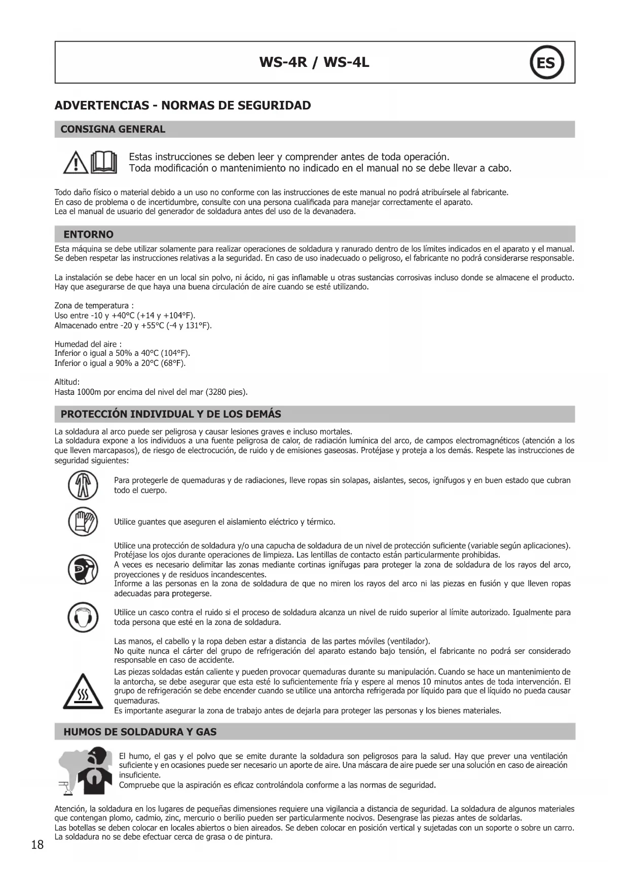 El humo, el gas y el polvo que se emite durante la soldadura son peligrosos para la salud. Hay que prever una ventilación suciente y en ocasiones puede ser necesario un aporte de aire. Una máscara de aire puede ser una solución en caso de aireación insuciente. Compruebe que la aspiración es ecaz controlándola conforme a las normas de seguridad. Atención, la soldadura en los lugares de pequeñas dimensiones requiere una vigilancia a distancia de seguridad. La soldadura de algunos materiales que contengan plomo, cadmio, zinc, mercurio o berilio pueden ser particularmente nocivos. Desengrase las piezas antes de soldarlas. Las botellas se deben colocar en locales abiertos o bien aireados. Se deben colocar en posición vertical y sujetadas con un soporte o sobre un carro. La soldadura no se debe efectuar cerca de grasa o de pintura. 18WS-4R / WS-4L