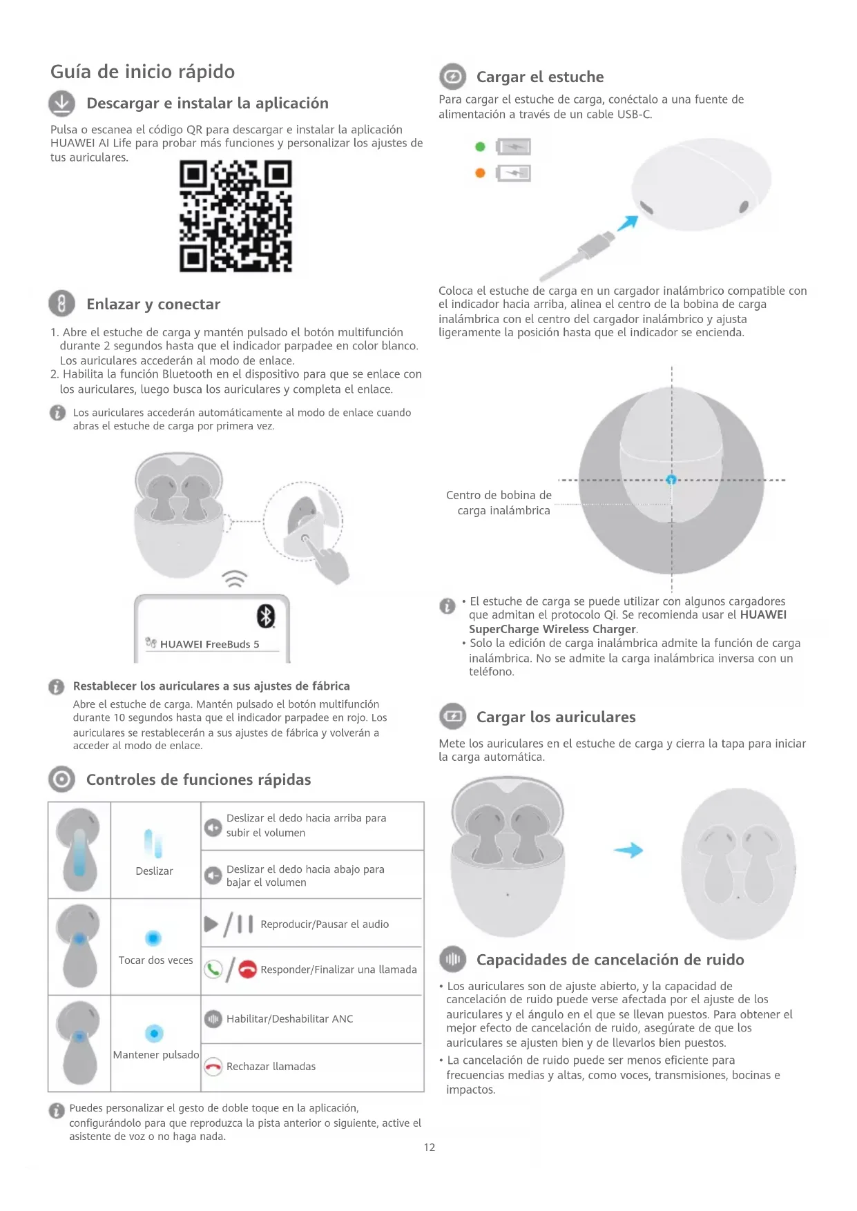 los auriculares, luego busca los auriculares y completa el enlace. Enlazar y conectar Los auriculares accederán automáticamente al modo de enlace cuando abras el estuche de carga por primera vez. Abre el estuche de carga. Mantén pulsado el botón multifunción durante 10 segundos hasta que el indicador parpadee en rojo. Los auriculares se restablecerán a sus ajustes de fábrica y volverán a acceder al modo de enlace. Restablecer los auriculares a sus ajustes de fábrica Pulsa o escanea el código QR para descargar e instalar la aplicación HUAWEI AI Life para probar más funciones y personalizar los ajustes de tus auriculares. Descargar e instalar la aplicación Controles de funciones rápidas Puedes personalizar el gesto de doble toque en la aplicación, configurándolo para que reproduzca la pista anterior o siguiente, active el asistente de voz o no haga nada. Para cargar el estuche de carga, conéctalo a una fuente de alimentación a través de un cable USB-C. Coloca el estuche de carga en un cargador inalámbrico compatible con el indicador hacia arriba, alinea el centro de la bobina de carga inalámbrica con el centro del cargador inalámbrico y ajusta ligeramente la posición hasta que el indicador se encienda. Cargar el estuche Capacidades de cancelación de ruido