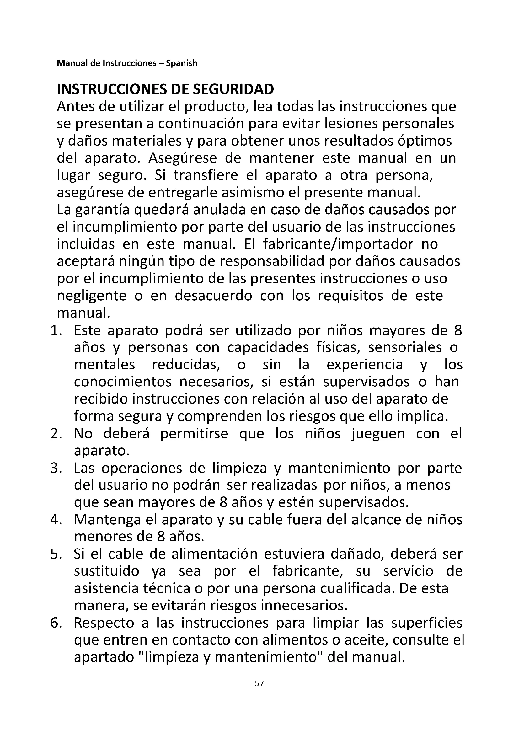 Antes de utilizar el producto, lea todas las instrucciones que se presentan a continuación para evitar lesiones personales y daños materiales y para obtener unos resultados óptimos del aparato. Asegúrese de mantener este manual en un lugar seguro. Si transfiere el aparato a otra persona, asegúrese de entregarle asimismo el presente manual. La garantía quedará anulada en caso de daños causados por el incumplimiento por parte del usuario de las instrucciones incluidas en este manual. El fabricante/importador no aceptará ningún tipo de responsabilidad por daños causados por el incumplimiento de las presentes instrucciones o uso negligente o en desacuerdo con los requisitos de este manual.