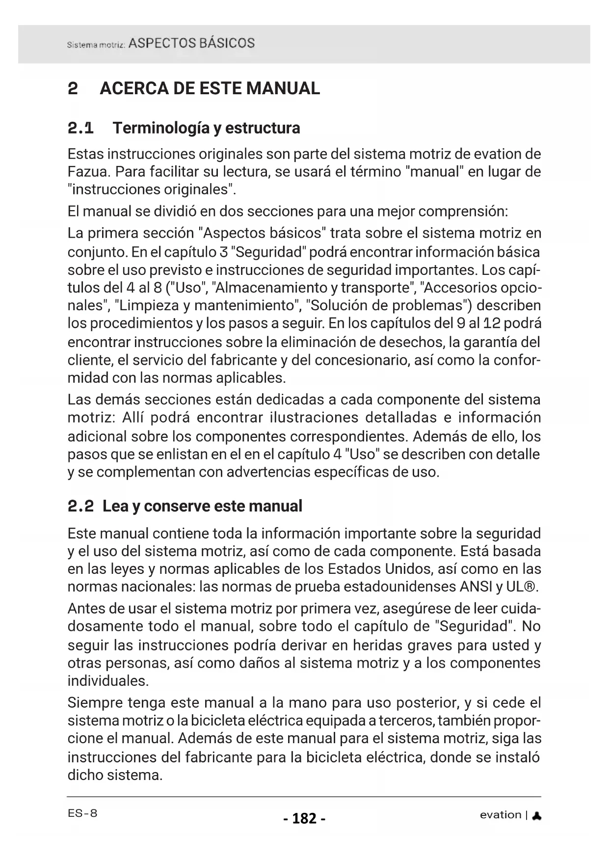 Este manual contiene toda la información importante sobre la seguridad y el uso del sistema motriz, así como de cada componente. Está basada en las leyes y normas aplicables de los Estados Unidos, así como en las normas nacionales: las normas de prueba estadounidenses ANSI y UL®. Antes de usar el sistema motriz por primera vez, asegúrese de leer cuida- dosamente todo el manual, sobre todo el capítulo de "Seguridad". No seguir las instrucciones podría derivar en heridas graves para usted y otras personas, así como daños al sistema motriz y a los componentes individuales. Siempre tenga este manual a la mano para uso posterior, y si cede el sistema motriz o la bicicleta eléctrica equipada a terceros, también propor- cione el manual. Además de este manual para el sistema motriz, siga las instrucciones del fabricante para la bicicleta eléctrica, donde se instaló dicho sistema. FAZUA Original_Instrucion_ES_MX.indb 8FAZUA Original_Instrucion_ES_MX.indb 8 28-Feb-20 13:56:3028-Feb-20 13:56:30 - 182 -ES-9 | evation La marca denominativa Bluetooth® y los logotipos son marcas regis- tradas de Bluetooth SIG, Inc., y Fazua hace uso de estas bajo licencia. Este manual no se puede reproducir, modificar, distribuir ni utilizar de ninguna forma, ni total ni parcialmente, sin el permiso previo por escrito.