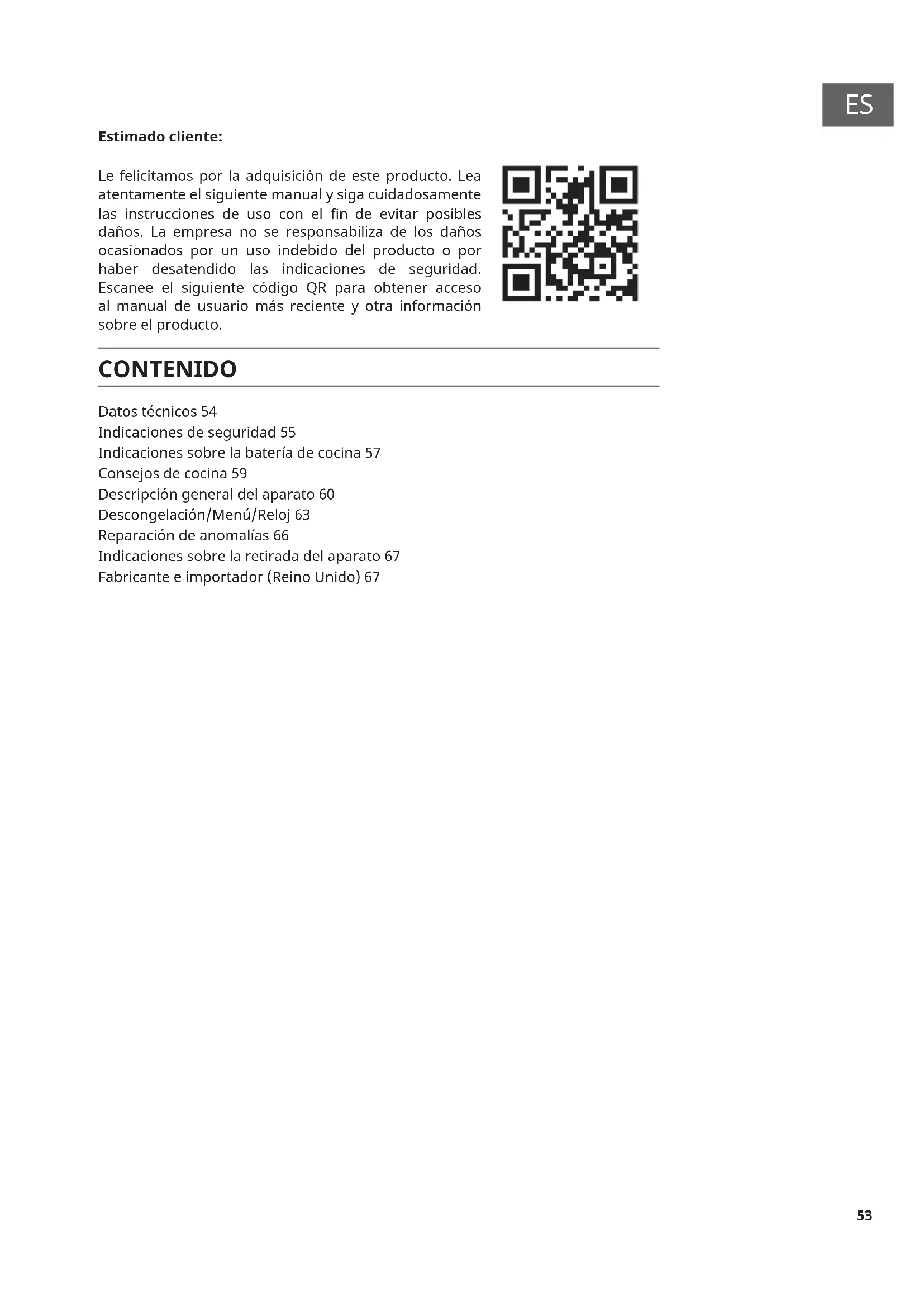 Estimado cliente: Le felicitamos por la adquisición de este producto. Lea atentamente el siguiente manual y siga cuidadosamente las instrucciones de uso con el n de evitar posibles daños. La empresa no se responsabiliza de los daños ocasionados por un uso indebido del producto o por haber desatendido las indicaciones de seguridad. Escanee el siguiente código QR para obtener acceso al manual de usuario más reciente y otra información sobre el producto. Datos técnicos 54 Indicaciones de seguridad 55 Indicaciones sobre la batería de cocina 57 Consejos de cocina 59 Descripción general del aparato 60 Descongelación/Menú/Reloj 63 Reparación de anomalías 66 Indicaciones sobre la retirada del aparato 67 Fabricante e importador (Reino Unido) 67 CONTENIDO54