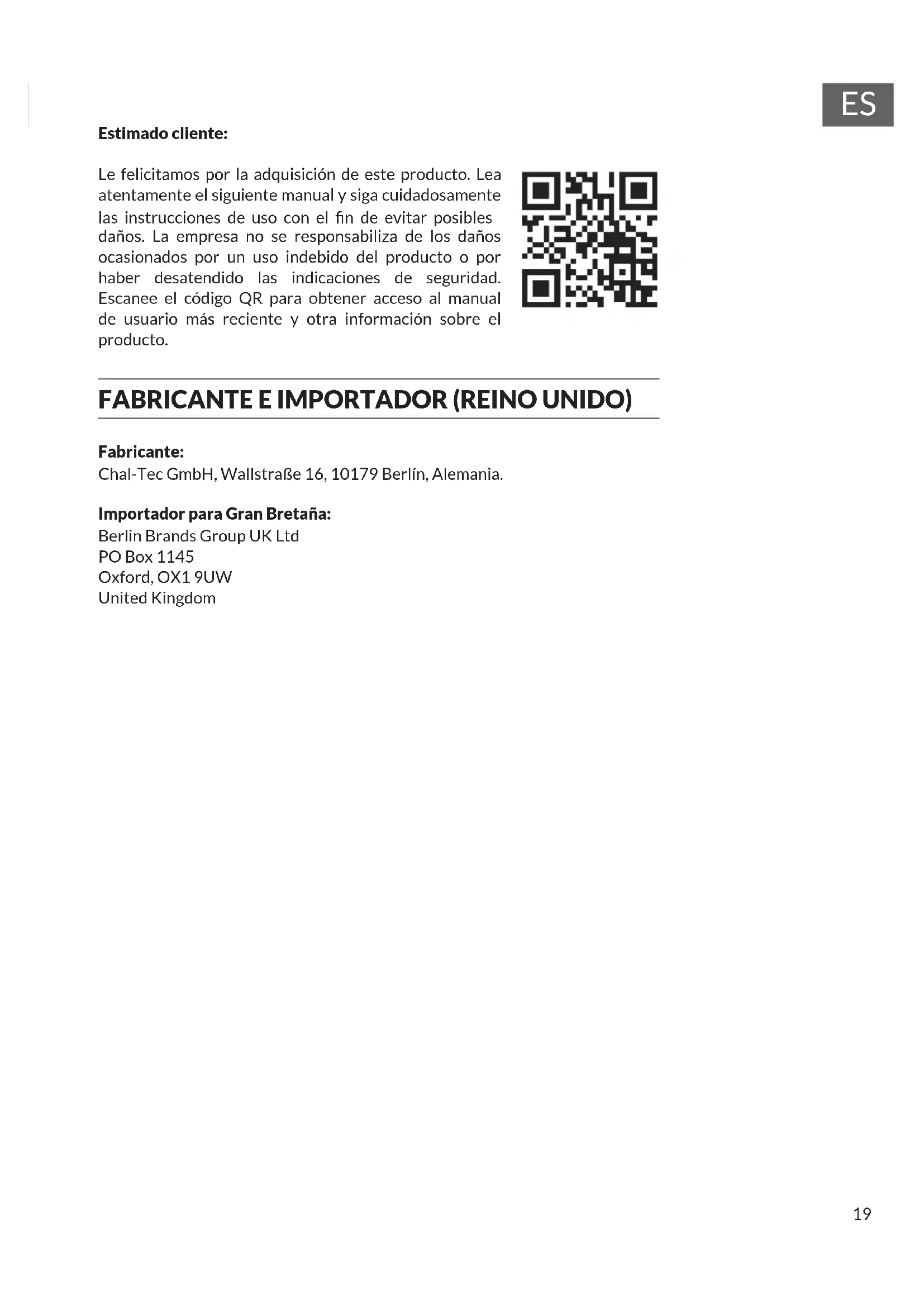 Estimado cliente: Le felicitamos por la adquisición de este producto. Lea atentamente el siguiente manual y siga cuidadosamente las instrucciones de uso con el n de evitar posibles daños. La empresa no se responsabiliza de los daños ocasionados por un uso indebido del producto o por haber desatendido las indicaciones de seguridad. Escanee el código QR para obtener acceso al manual de usuario más reciente y otra información sobre el producto. FABRICANTE E IMPORTADOR (REINO UNIDO) Fabricante: Chal-Tec GmbH, Wallstraße 16, 10179 Berlín, Alemania. Importador para Gran Bretaña: Berlin Brands Group UK Ltd PO Box 1145 Oxford, OX1 9UW United Kingdom20