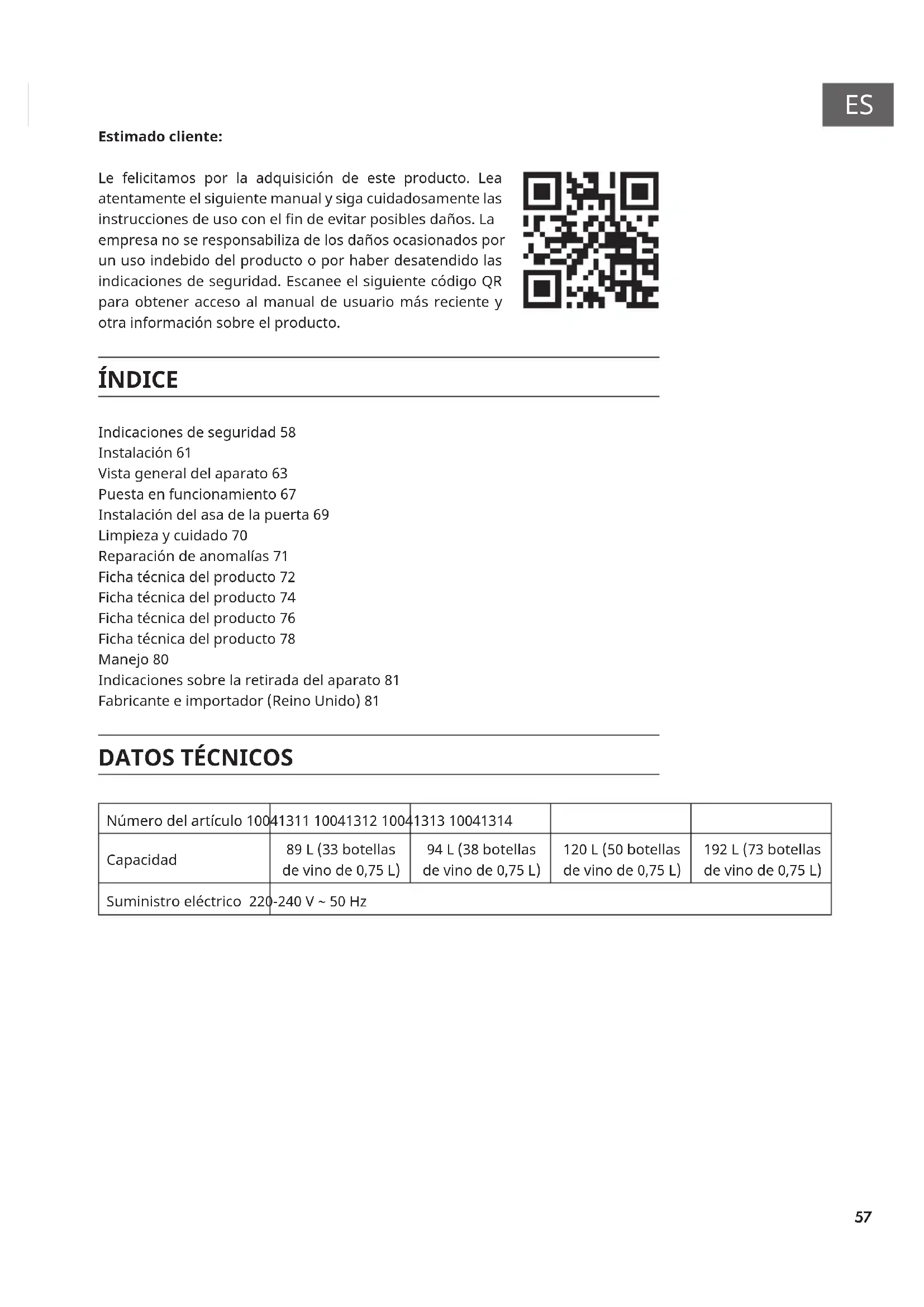 Estimado cliente: Le felicitamos por la adquisición de este producto. Lea atentamente el siguiente manual y siga cuidadosamente las instrucciones de uso con el n de evitar posibles daños. La empresa no se responsabiliza de los daños ocasionados por un uso indebido del producto o por haber desatendido las indicaciones de seguridad. Escanee el siguiente código QR para obtener acceso al manual de usuario más reciente y otra información sobre el producto. ÍNDICE Indicaciones de seguridad 58 Instalación 61 Vista general del aparato 63 Puesta en funcionamiento 67 Instalación del asa de la puerta 69 Limpieza y cuidado 70 Reparación de anomalías 71 Ficha técnica del producto 72 Ficha técnica del producto 74 Ficha técnica del producto 76 Ficha técnica del producto 78 Manejo 80 Indicaciones sobre la retirada del aparato 81 Fabricante e importador (Reino Unido) 81
