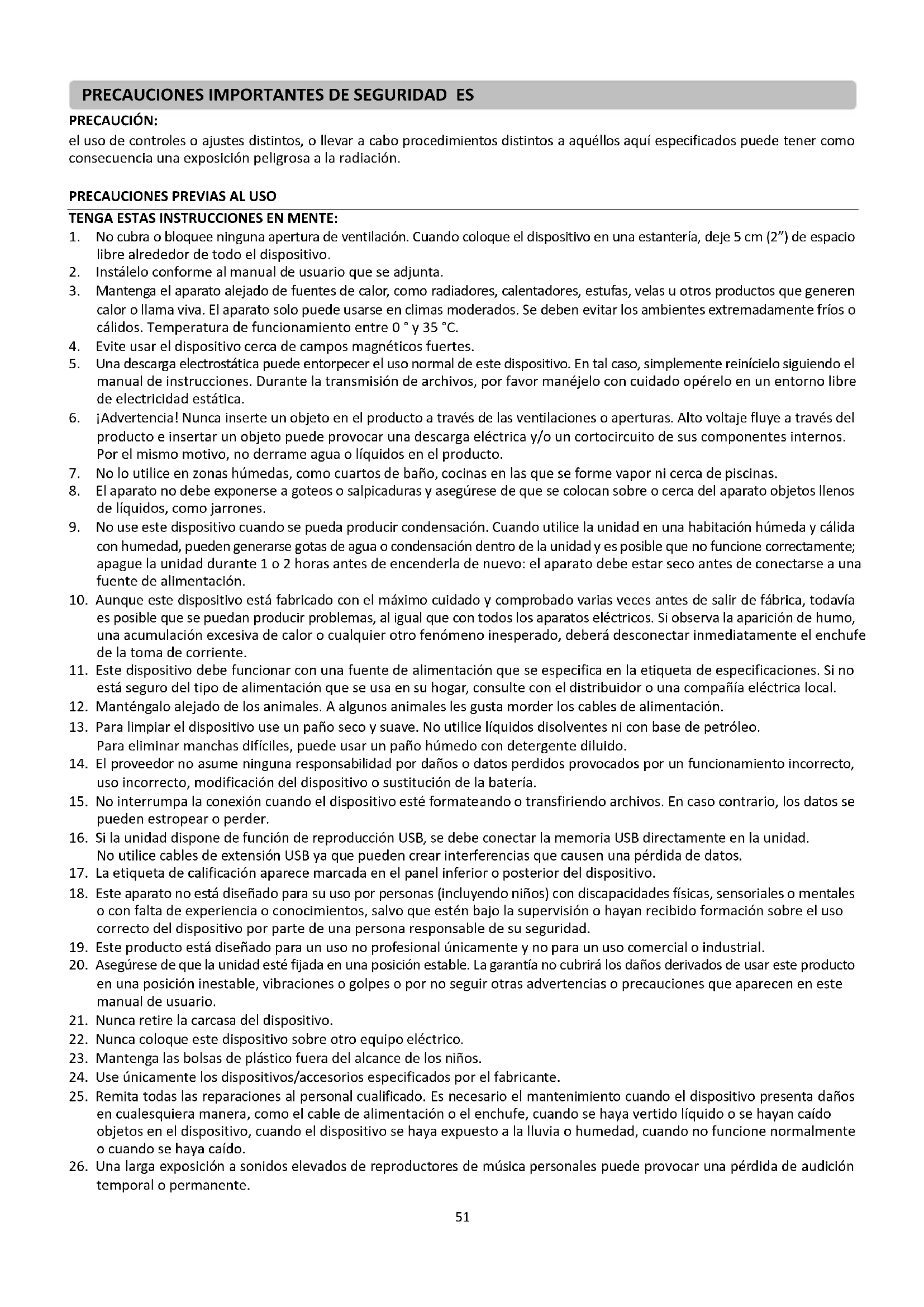 5. Una descarga electrostática puede entorpecer el uso normal de este dispositivo. En tal caso, simplemente reinícielo siguiendo el manual de instrucciones. Durante la transmisión de archivos, por favor manéjelo con cuidado opérelo en un entorno libre de electricidad estática. 6. ¡Advertencia! Nunca inserte un objeto en el producto a través de las ventilaciones o aperturas. Alto voltaje fluye a través del producto e insertar un objeto puede provocar una descarga eléctrica y/o un cortocircuito de sus componentes internos. Por el mismo motivo, no derrame agua o líquidos en el producto.