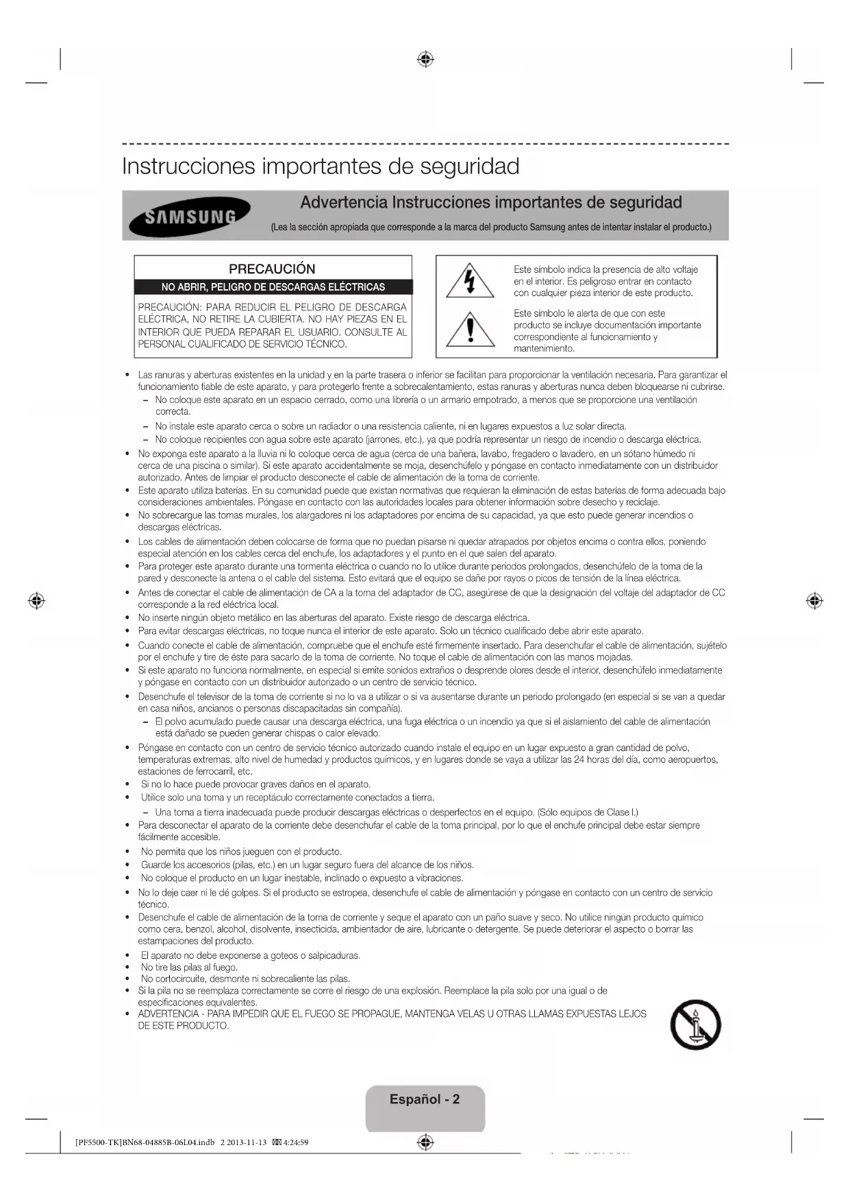 - ADVERTENCIA - PARA IMPEDIR QUE EL FUEGO SE PROPAGUE, MANTENGA VELAS U OTRAS LLAMAS EXPUESTAS LEJOS DE ESTE PRODUCTO. [PF5500-TK]BN68-04885B-06L04.indb 2 2013-11-13 4:24:59Español - 3 Español Las figuras y las ilustraciones de este Manual del usuario se proporcionan como referencia solamente y pueden no coincidir con el aspecto real del producto. El diseño y las especificaciones del producto están sujetos a cambios sin previo aviso. Los idiomas de la CIS (ruso, ucraniano, kazajo) no están disponibles para este producto, ya que se fabrica para usuarios de la Unión Europea. Funciones del nuevo televisor