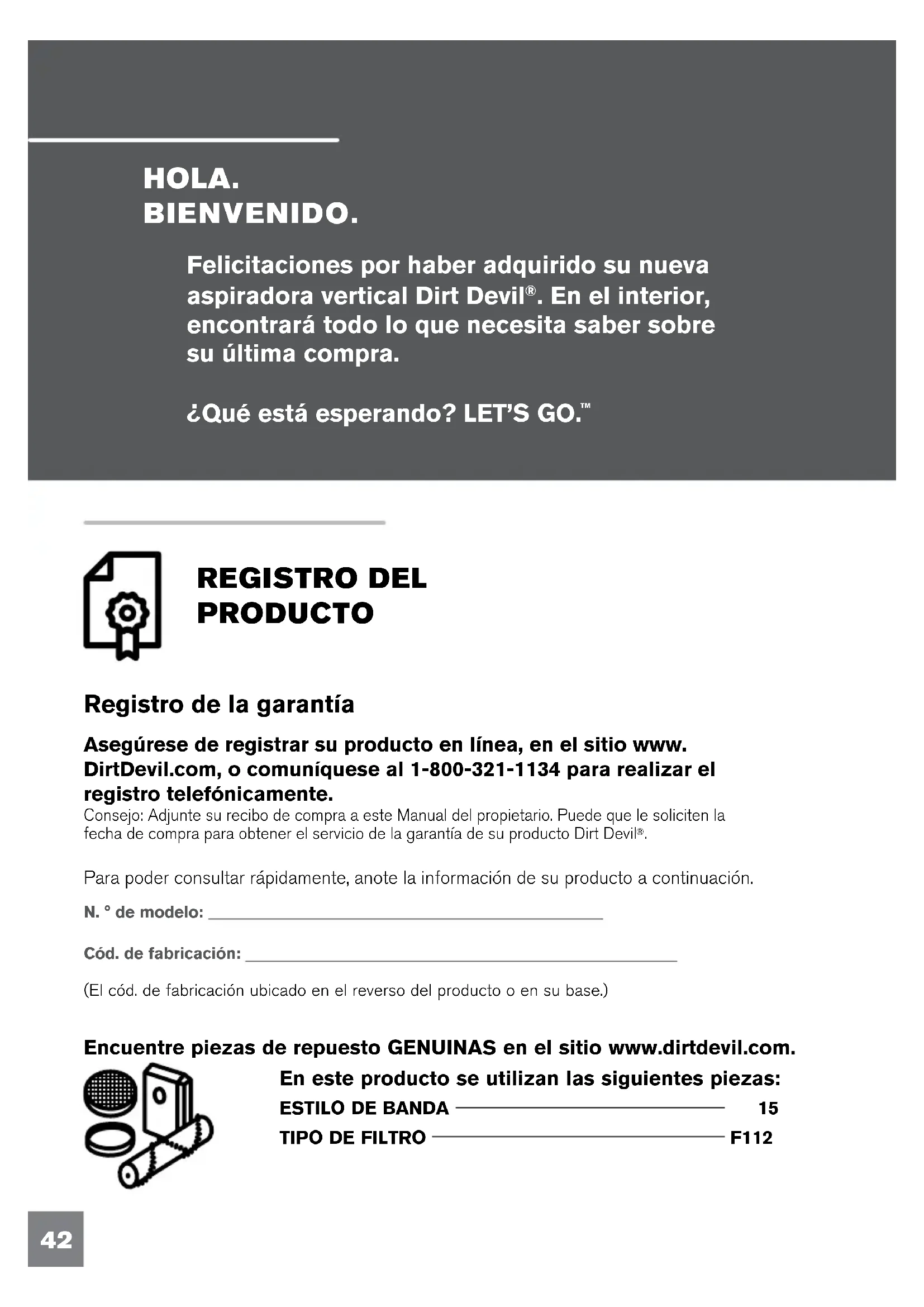 Compact Upright Mi modelo es: UD20120 / UD20121 MANUAL DEL USUARIO #961152120 / R4©2020 Todos los derechos reservados.SI NECESITA PIEZAS DE REPUESTO• ESTILO DE BANDA 15• TIPO DE FILTRO F112EL ÚNICO USO PREVISTO PARA ESTE PRODUCTO ES EL USO DOMÉSTICO. SI SE UTILIZA PARA USO COMERCIAL, SE INVALIDA LA GARANTÍA.42 HOLA. BIENVENIDO. REGISTRO DEL PRODUCTO Para poder consultar rápidamente, anote la información de su producto a continuación. N. ° de modelo: Cód. de fabricación: (El cód. de fabricación ubicado en el reverso del producto o en su base.) Registro de la garantía Asegúrese de registrar su producto en línea, en el sitio www. DirtDevil.com, o comuníquese al 1-800-321-1134 para realizar el registro telefónicamente. Consejo: Adjunte su recibo de compra a este Manual del propietario. Puede que le soliciten la fecha de compra para obtener el servicio de la garantía de su producto Dirt Devil