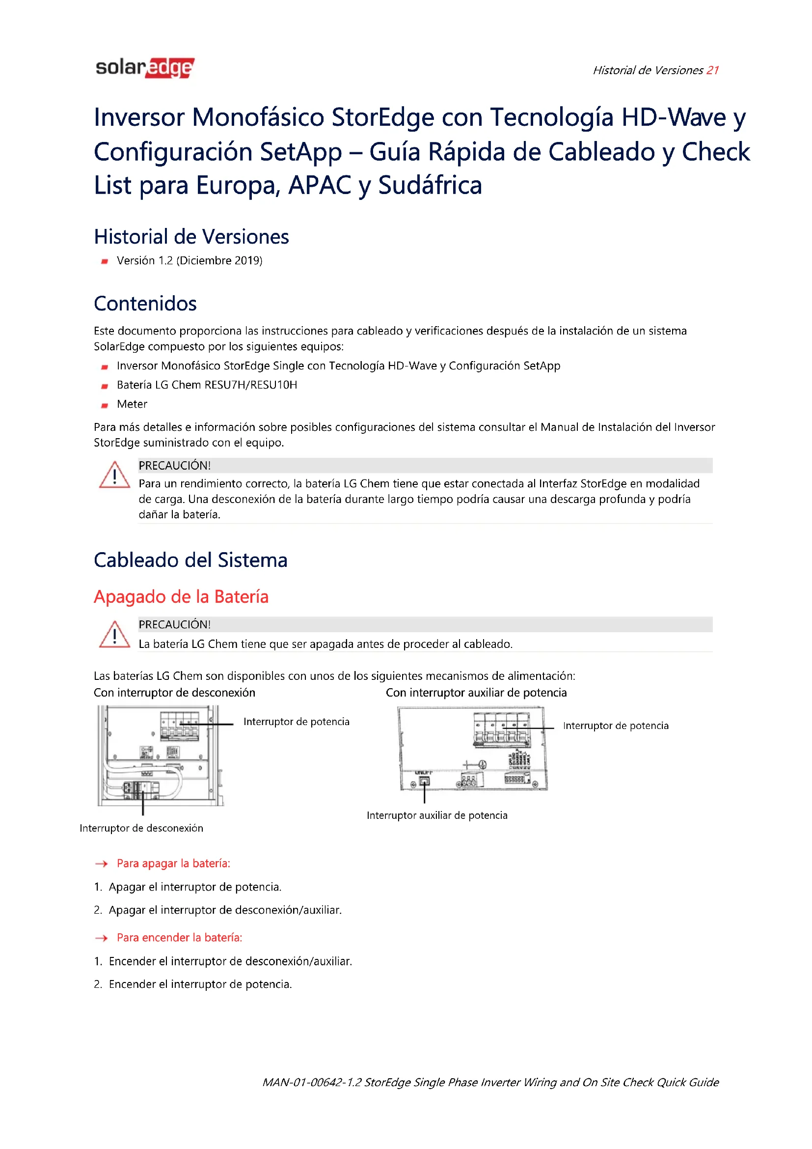 PRECAUCIÓN! Para un rendimiento correcto, la batería LG Chem tiene que estar conectada al Interfaz StorEdge en modalidad de carga. Una desconexión de la batería durante largo tiempo podría causar una descarga profunda y podría dañar la batería. Cableado del Sistema Apagado de la Batería